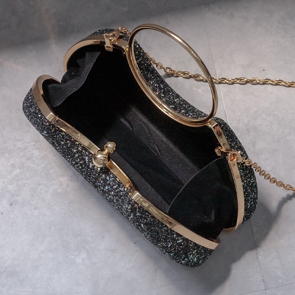 ゴールドのリングハンドルがエレガントなアクセントとなり、持つだけで洗練された印象に。