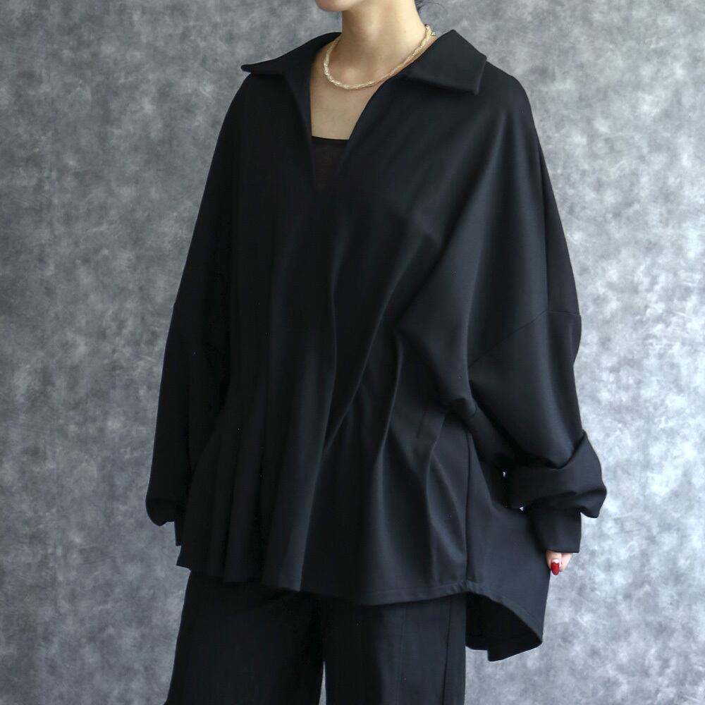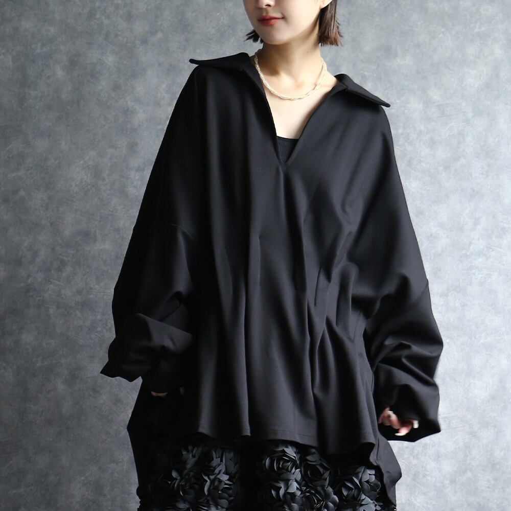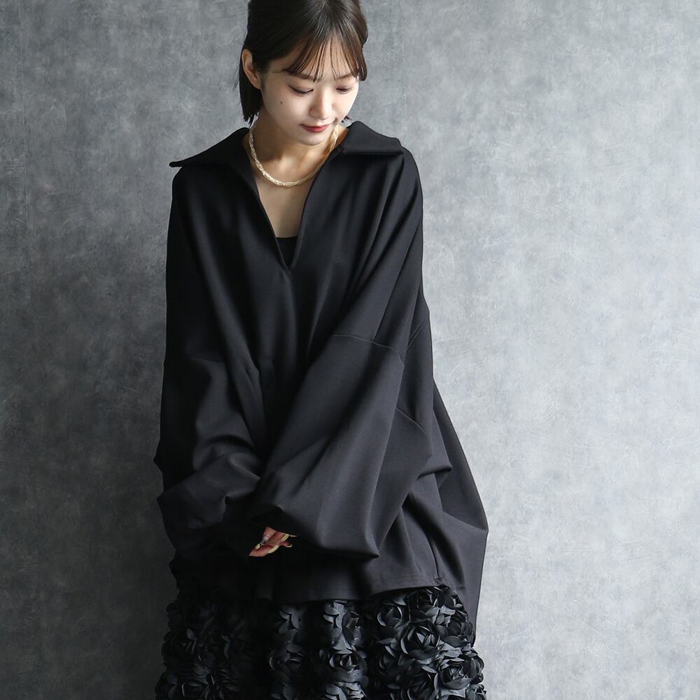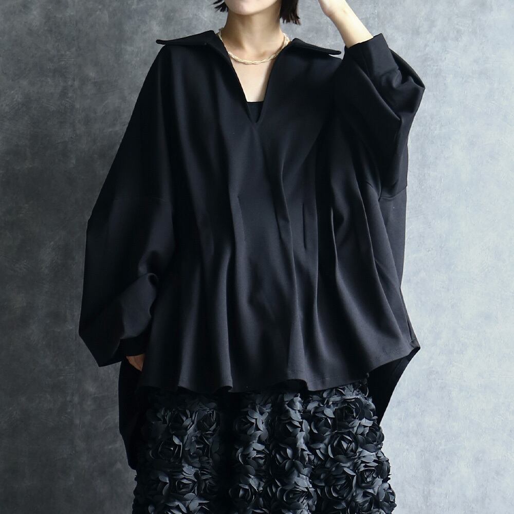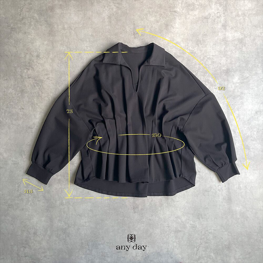 330068 any day エニーデイプルオーバー レディース 長袖 トップス 前後差 お尻が隠れる チュニック スキッパー スキッパーカラータックプルオーバー 大きめ オーバーサイズ 黒 ブラック 送料無料