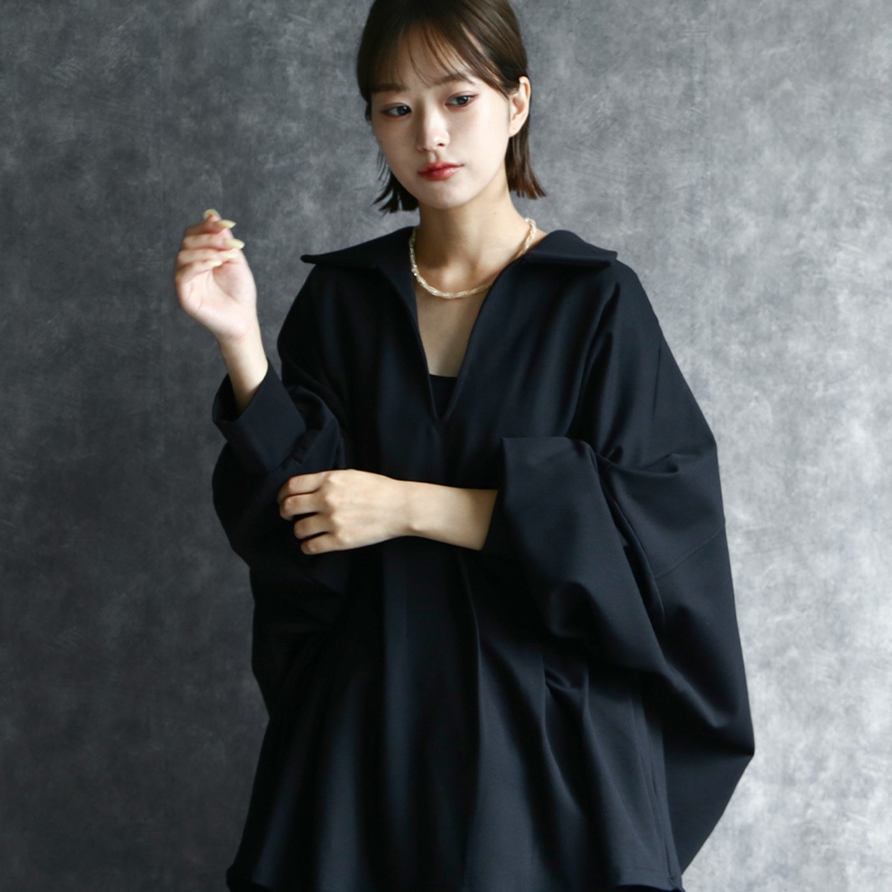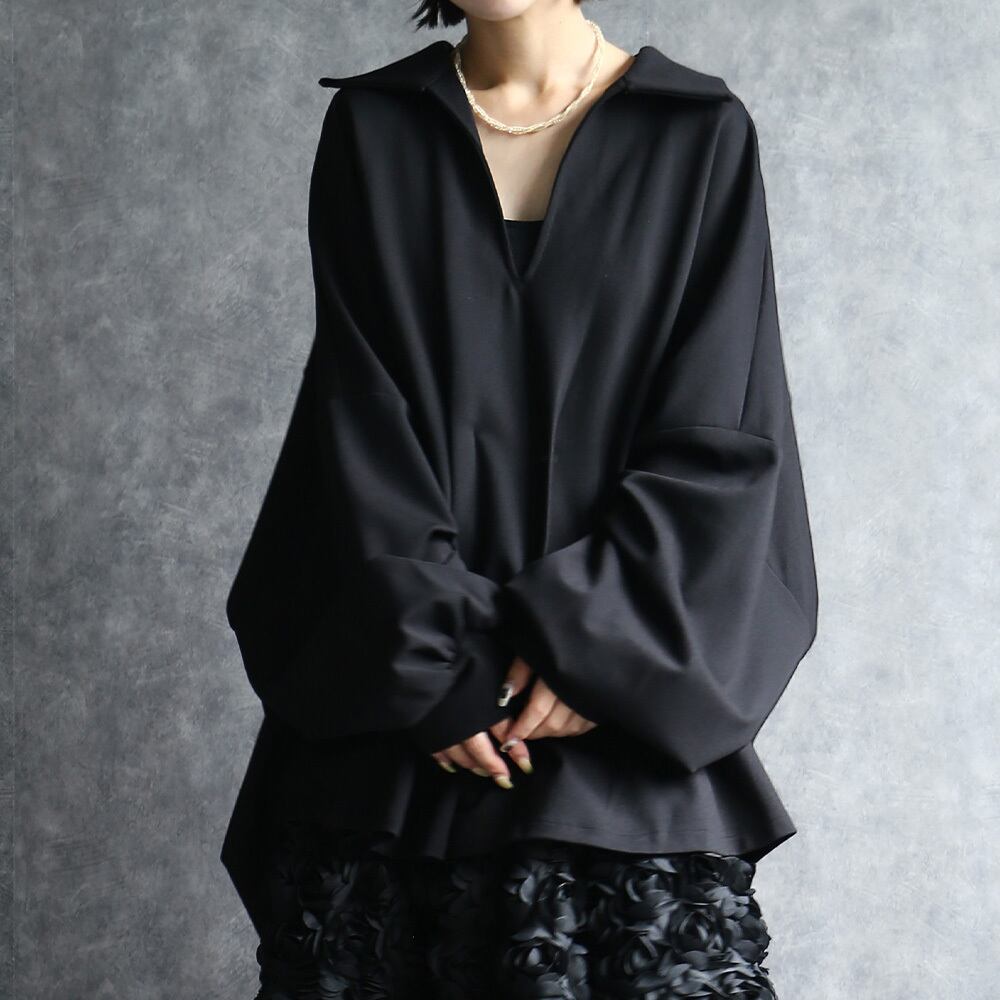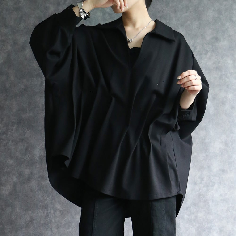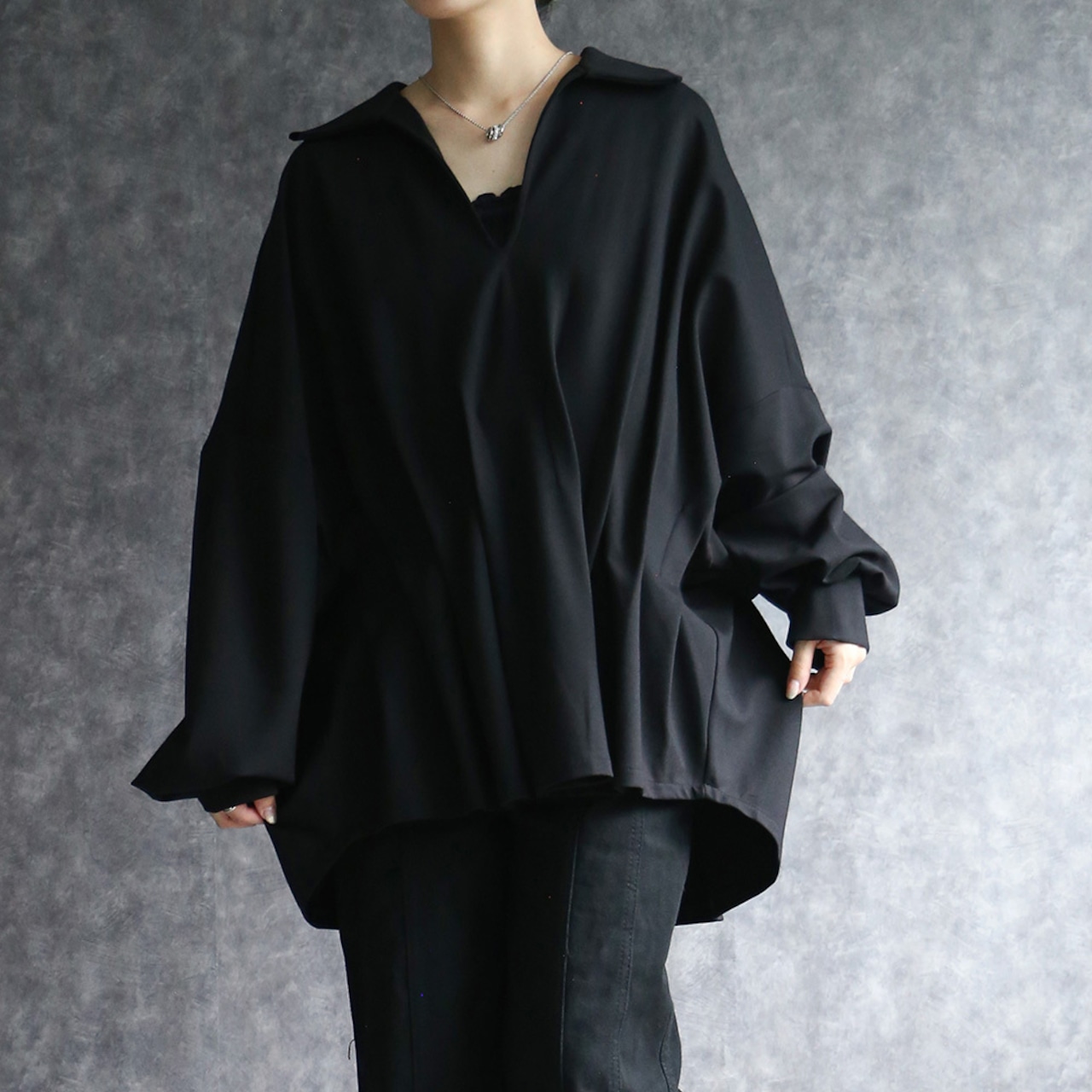 330068 any day エニーデイプルオーバー レディース 長袖 トップス 前後差 お尻が隠れる チュニック スキッパー スキッパーカラータックプルオーバー 大きめ オーバーサイズ 黒 ブラック 送料無料