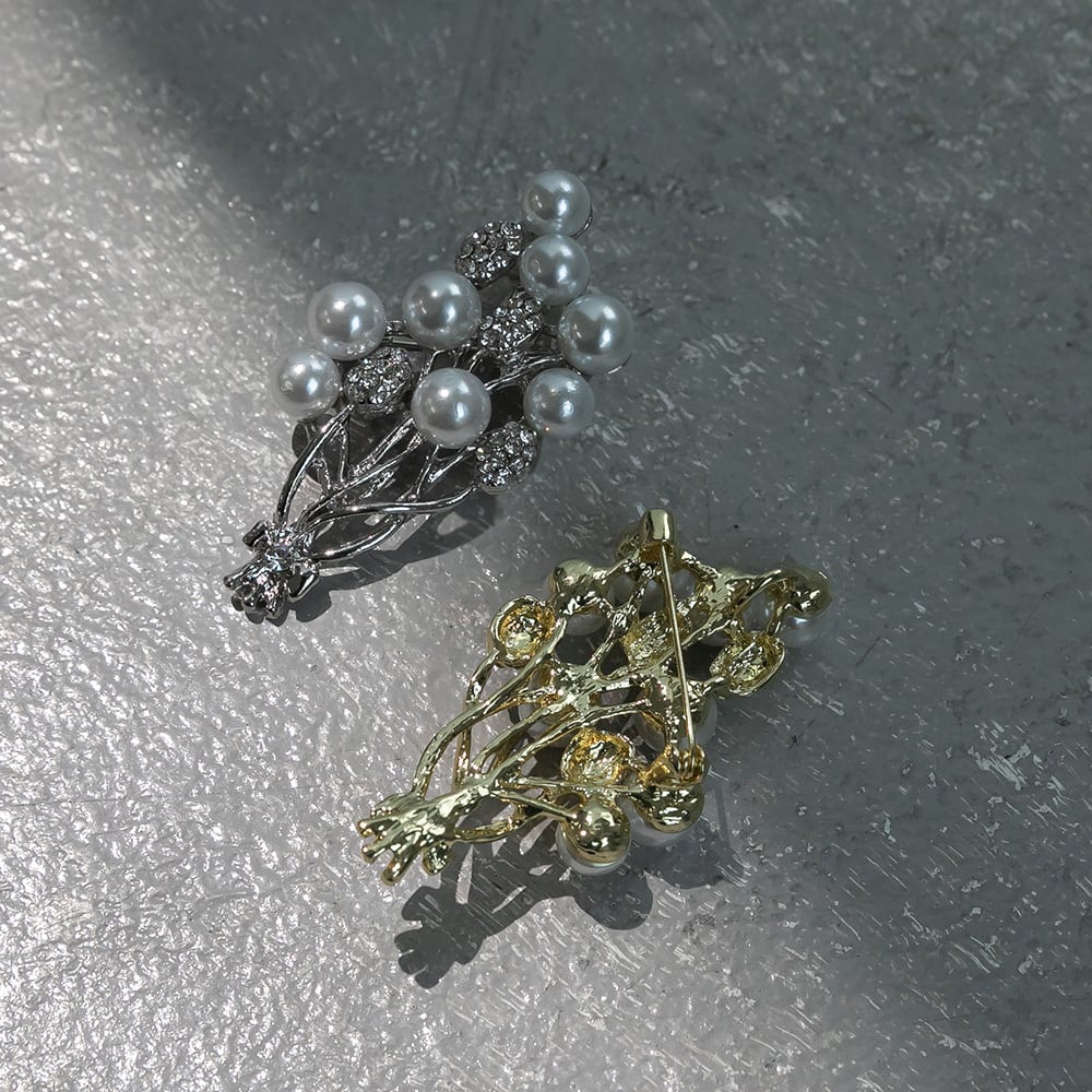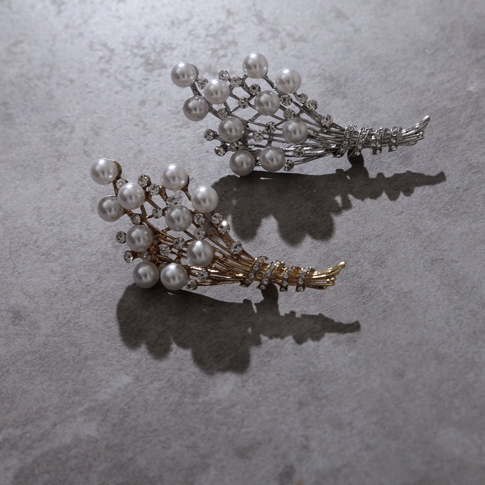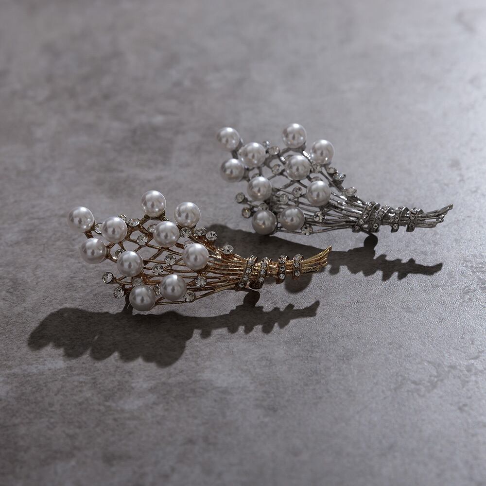 大小のパールとビジューが織りなす立体感が、装いに華やかさをプラスします。