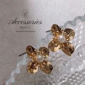 メタルの花びらに小粒のパールを添えた、程よく甘さを抑えたフラワーモチーフピアス。