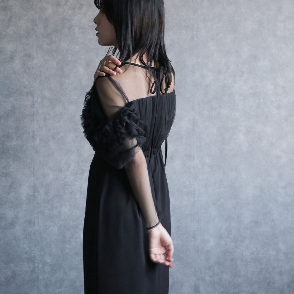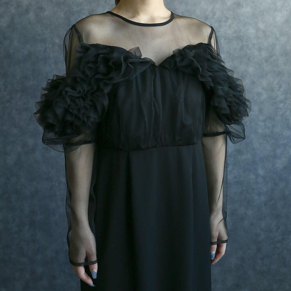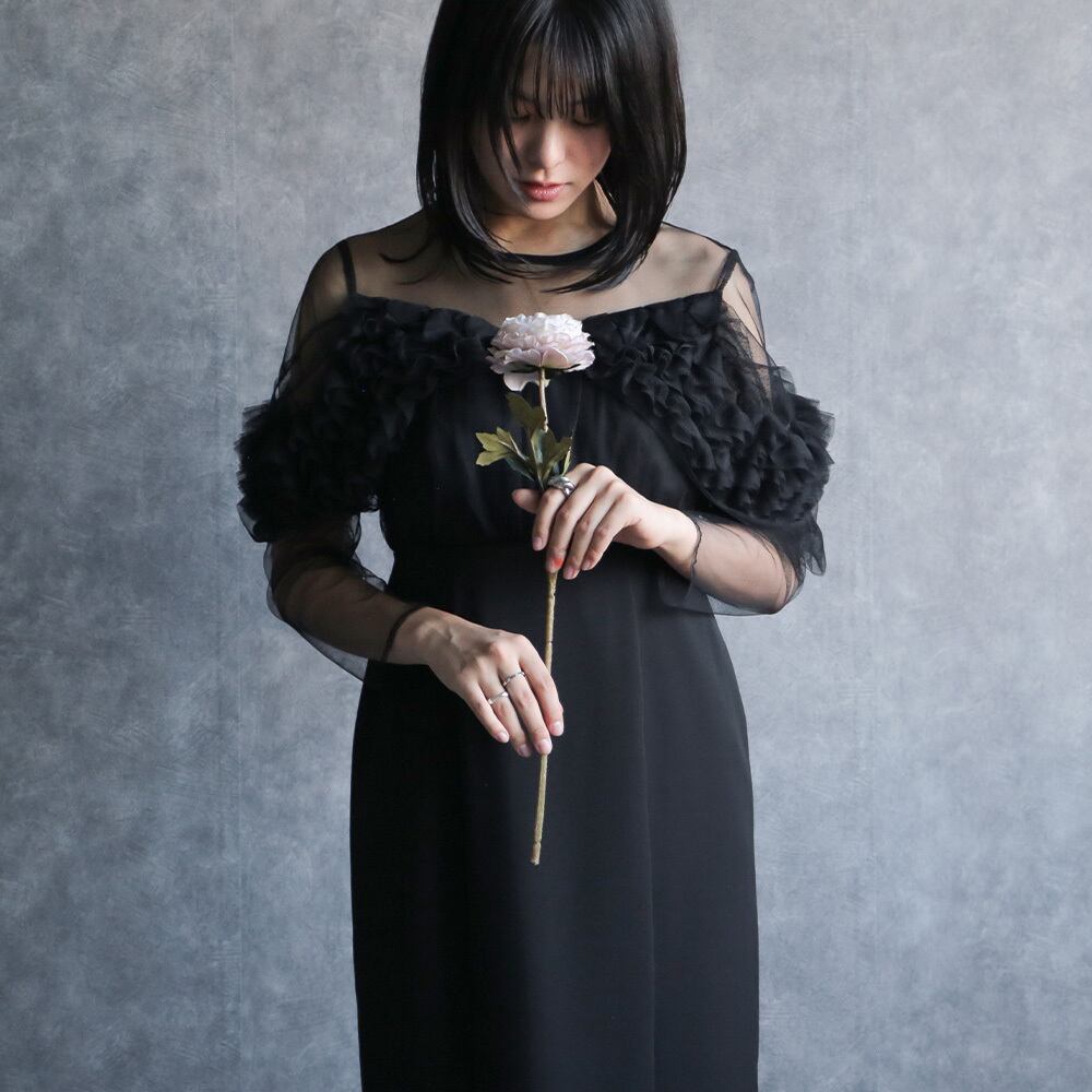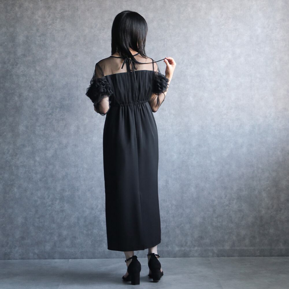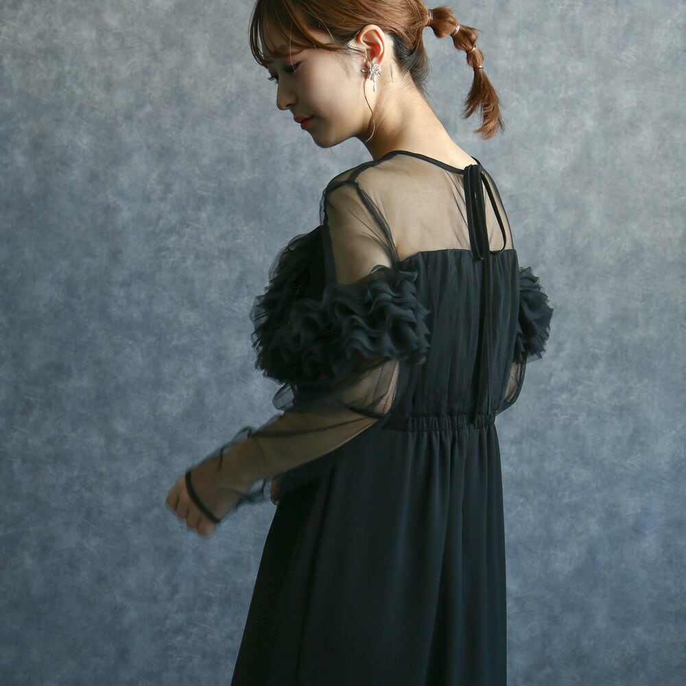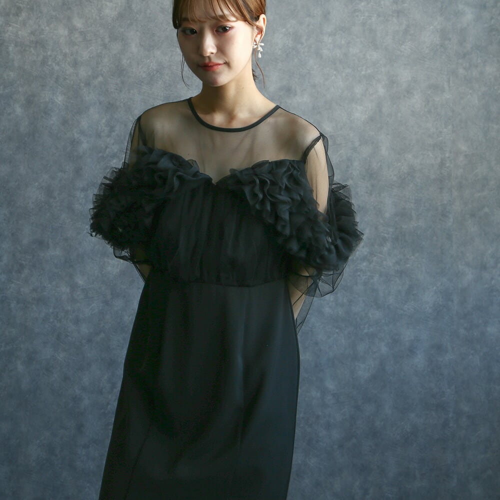 結婚式 ワンピース 長袖 チュール フリル ドレス 結婚式ゲスト ブラックドレス かわいい 華やか プチプラ 謝恩会 お呼ばれ 演奏会 卒業式 卒園式 食事会 お祝い 内祝い 入学式