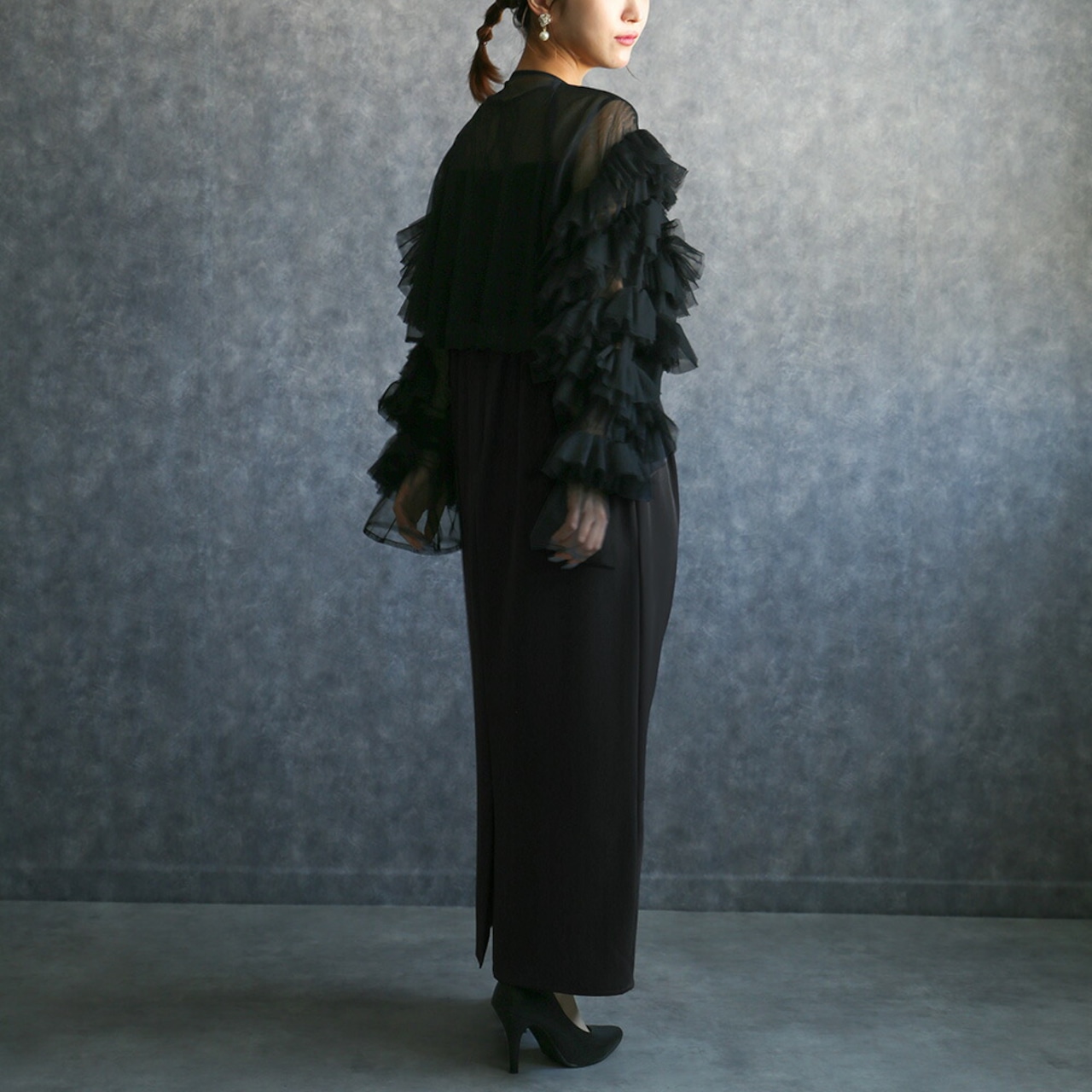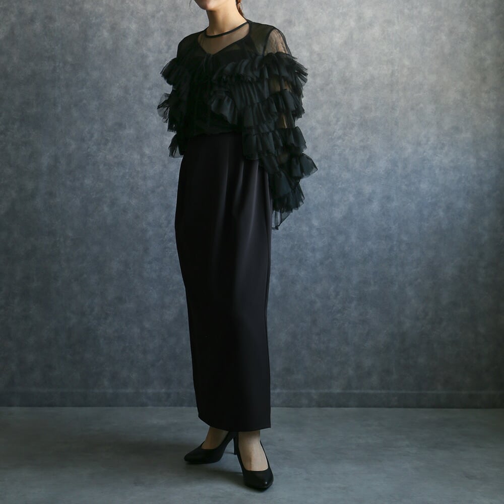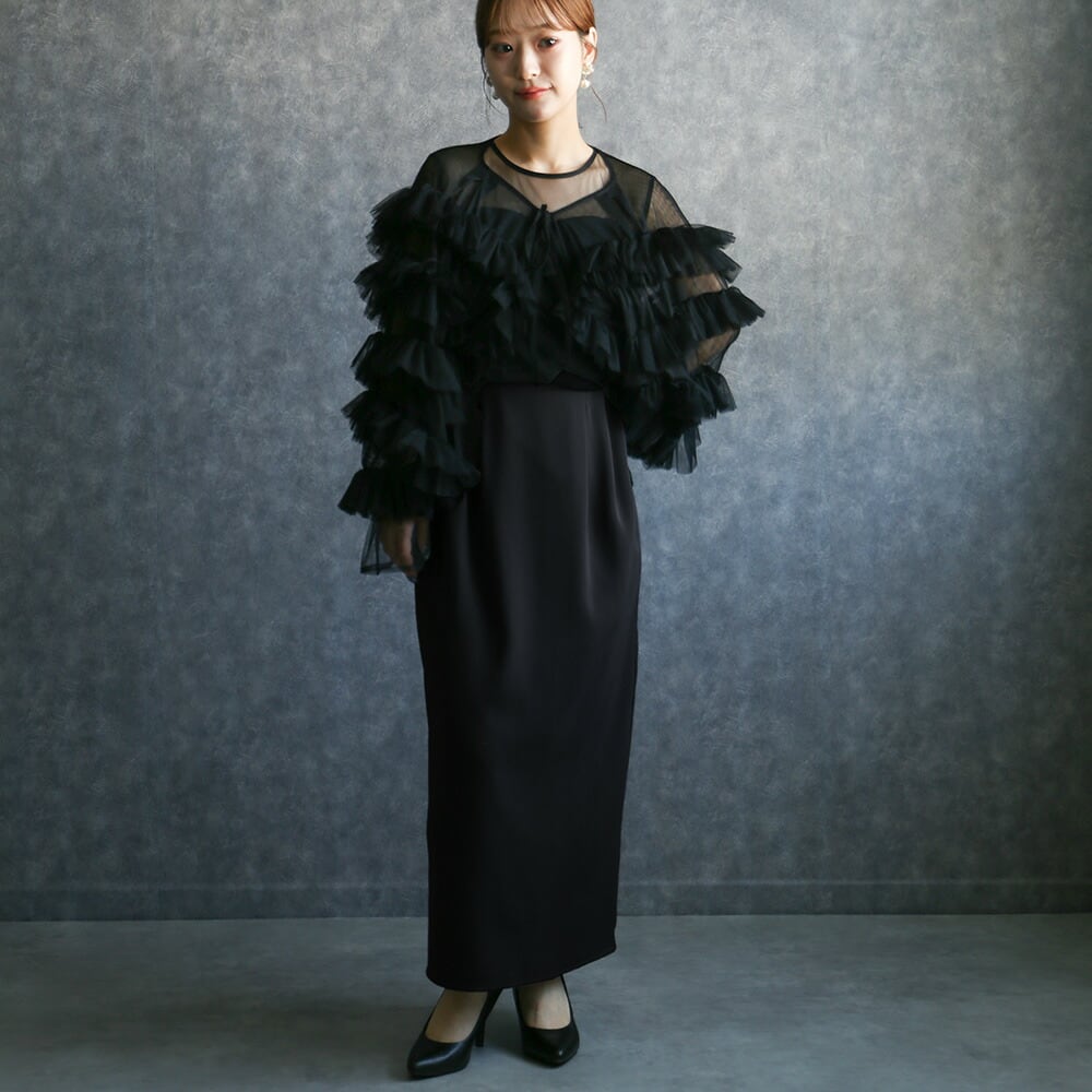 300183 any day エニーデイ結婚式 パーティードレス オケージョン ブラックドレス 華やか ボリュームチュールトップス&ノースリーブペンシルドレス フリル チュール フォーマル 20代 30代 40代 お呼ばれ 2次会 謝恩会 披露宴 同窓会 成人式 発表会 卒業式 卒園式 お祝い 内祝い 食事会 入学 卒業 送料無料