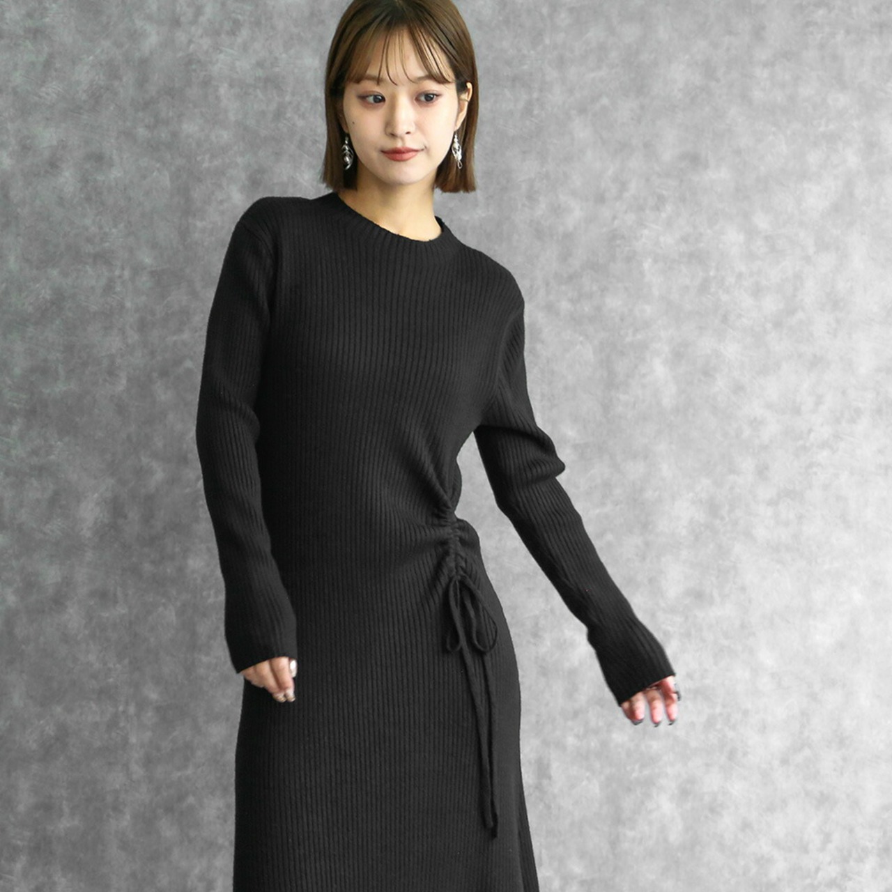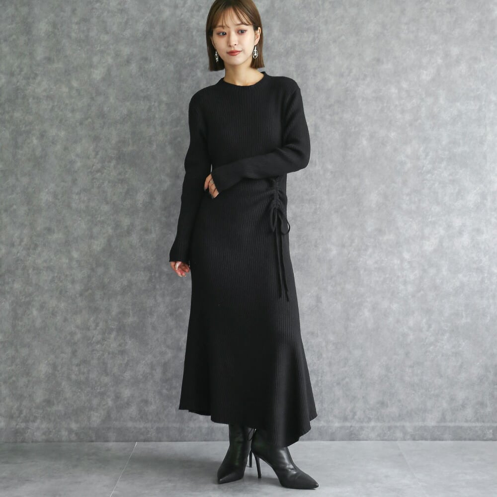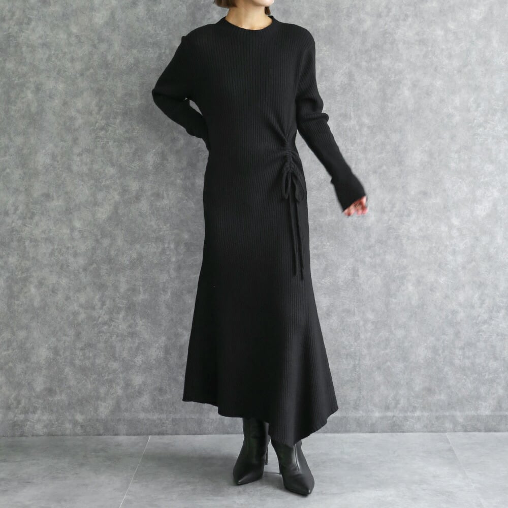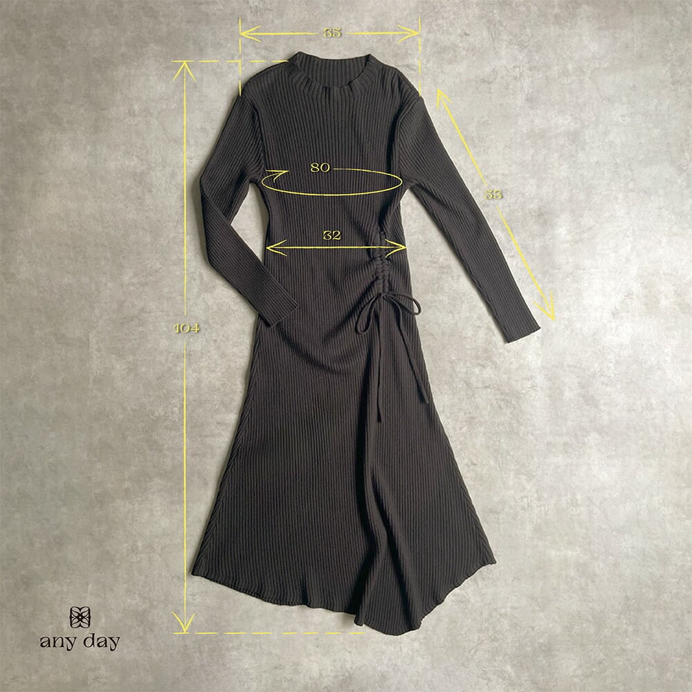 330081 any day エニーデイニットワンピース ロング ウエスト タイト 長袖 レディース 秋冬 黒ワンピ ワンピース タイトワンピース ドロスト 無地 伸縮性 着?せ きれいめ 大人 カジュアル クール モード 送料無料