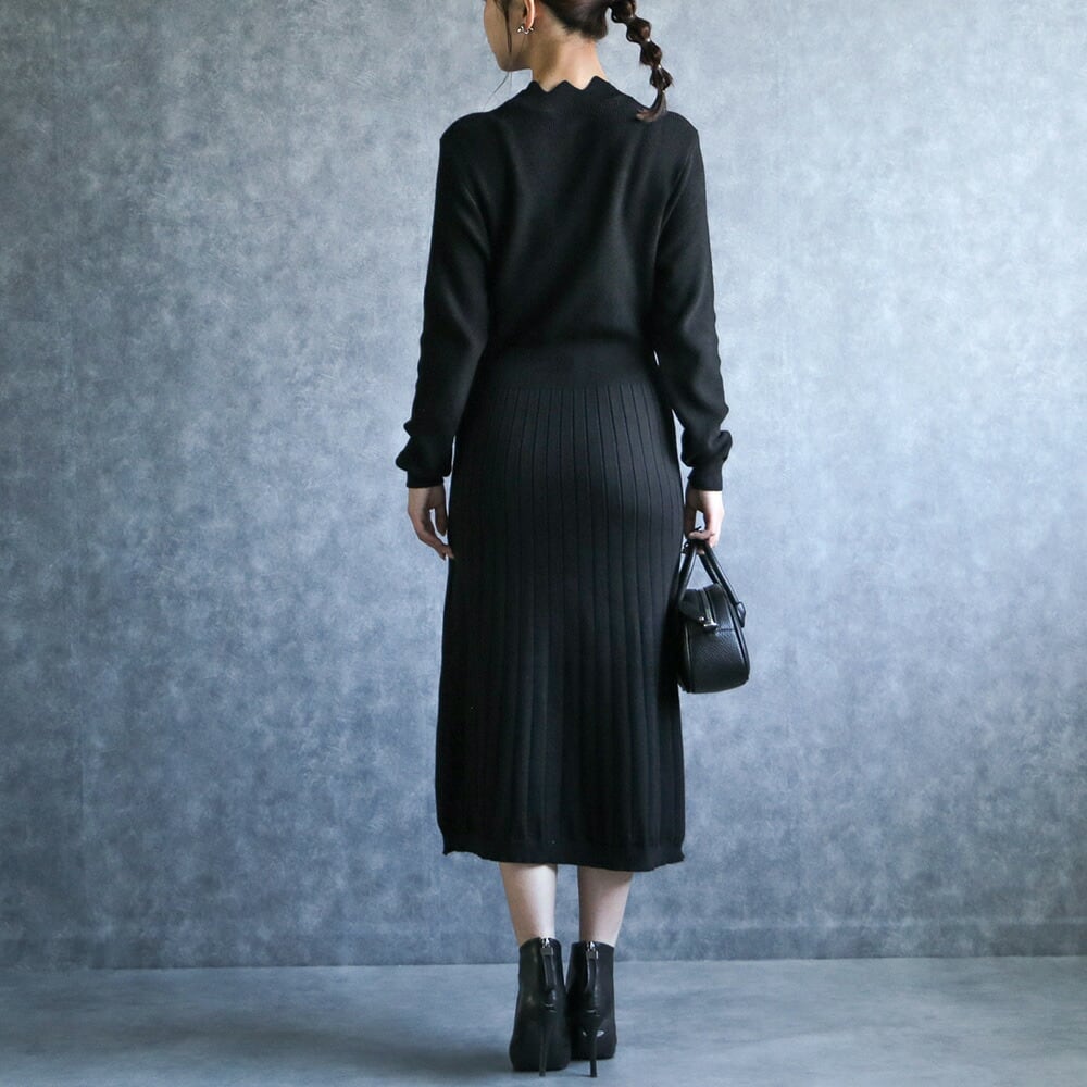 330083 any day エニーデイ デイニットワンピース Vネック スカラップ タイト 長袖 レディース 秋冬 黒ワンピ ワンピース タイトワンピース 無地 伸縮性 着?せ きれいめ 大人 デート カジュアル クール モード 送料無料