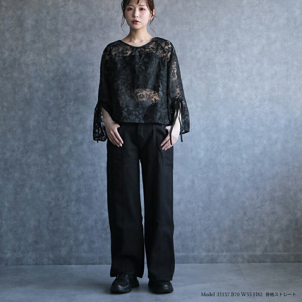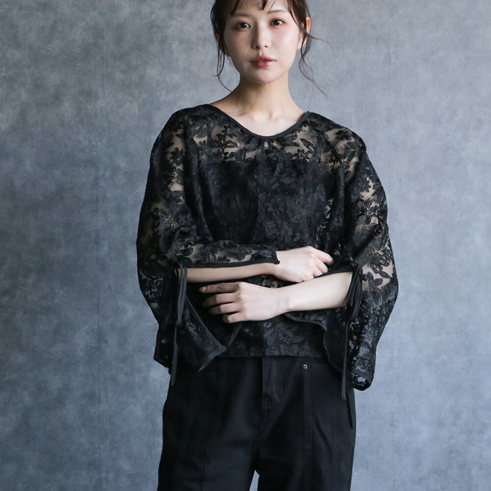 330105 any day エニーデイ ブラウス レース レディース 前後2way トップス フレアスリーブレースブラウス リボン オケージョン 華やか 花柄 長袖 透け感 デザイン ブラック 黒 送料無料
