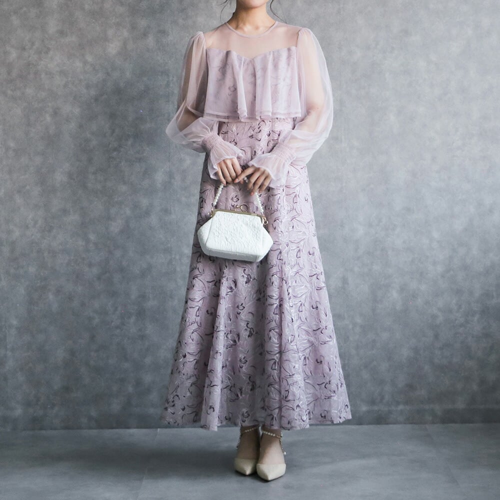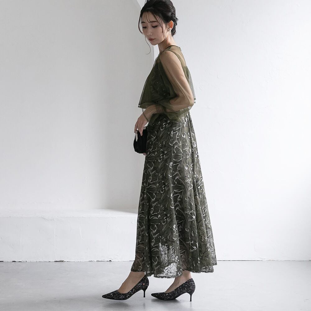 上品なチュールと刺繍レースが重なり合う、華やかなドレス。