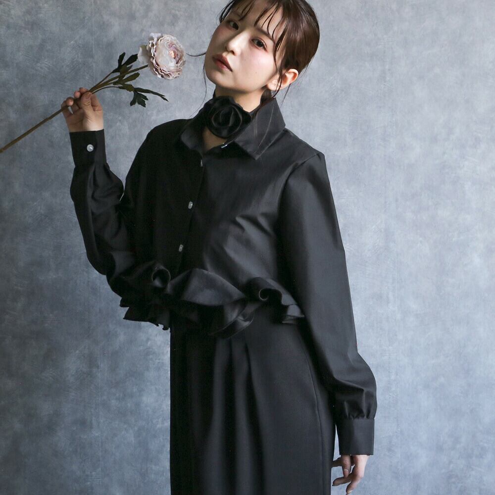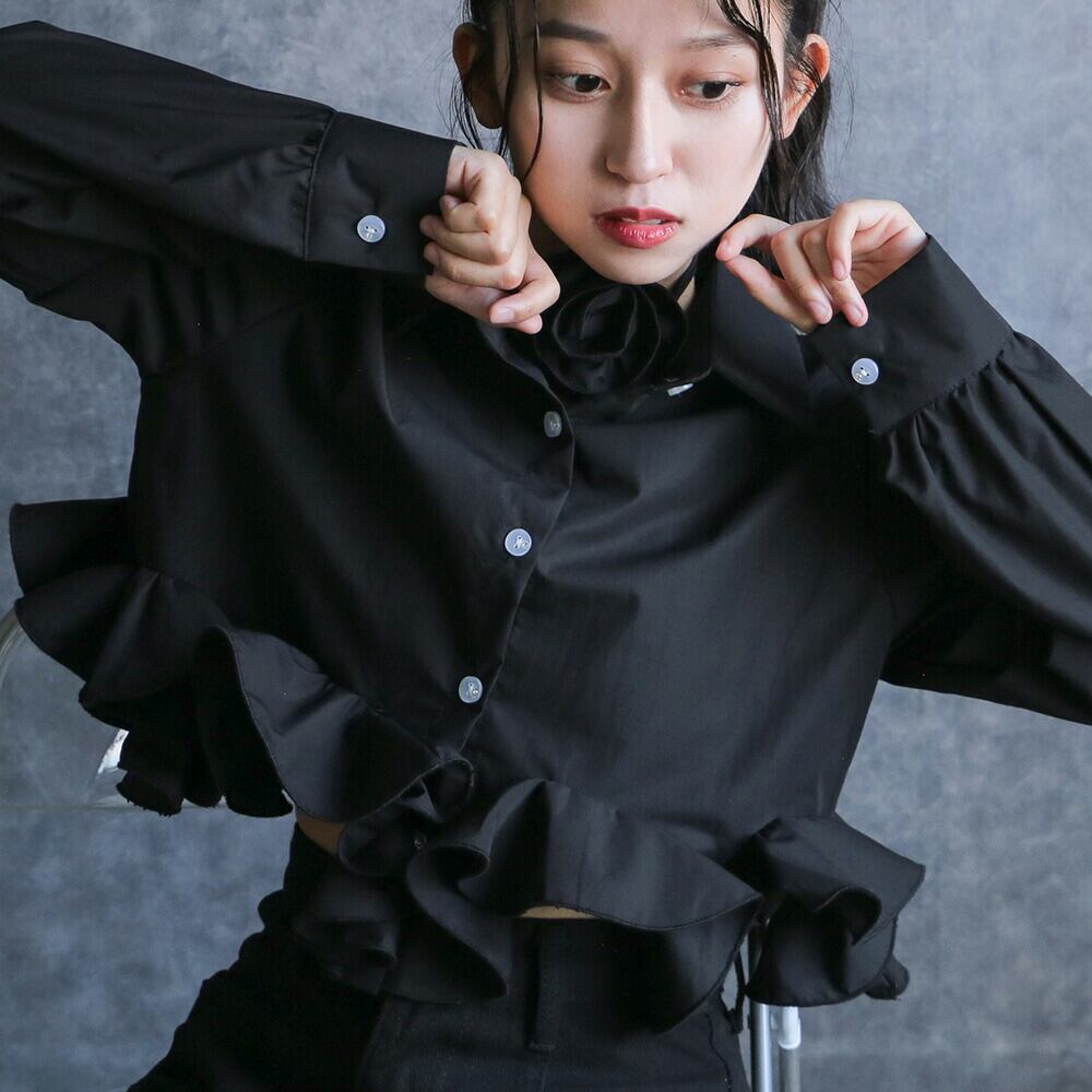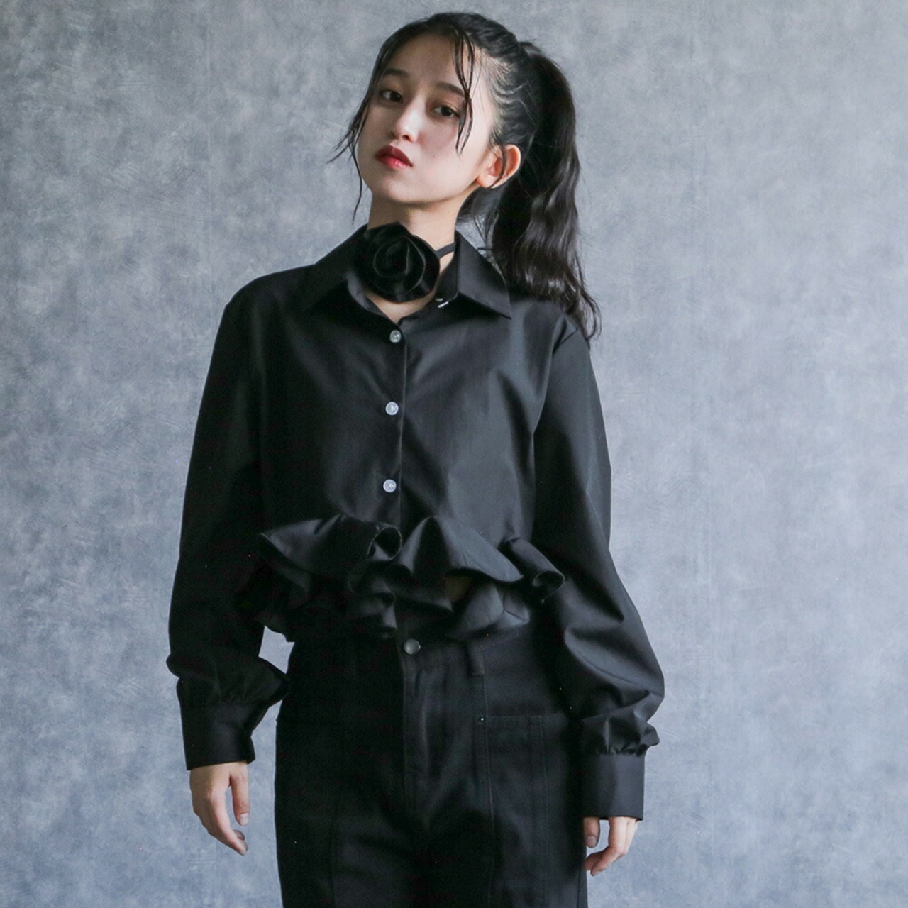 ショート丈シャツ ローズチョーカーネックレス トップス 黒 ブラック フォーマル おしゃれ かわいい フリル 体型カバー