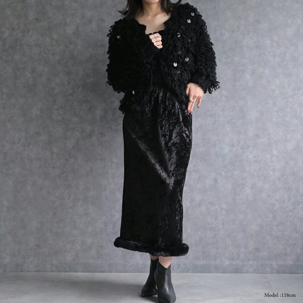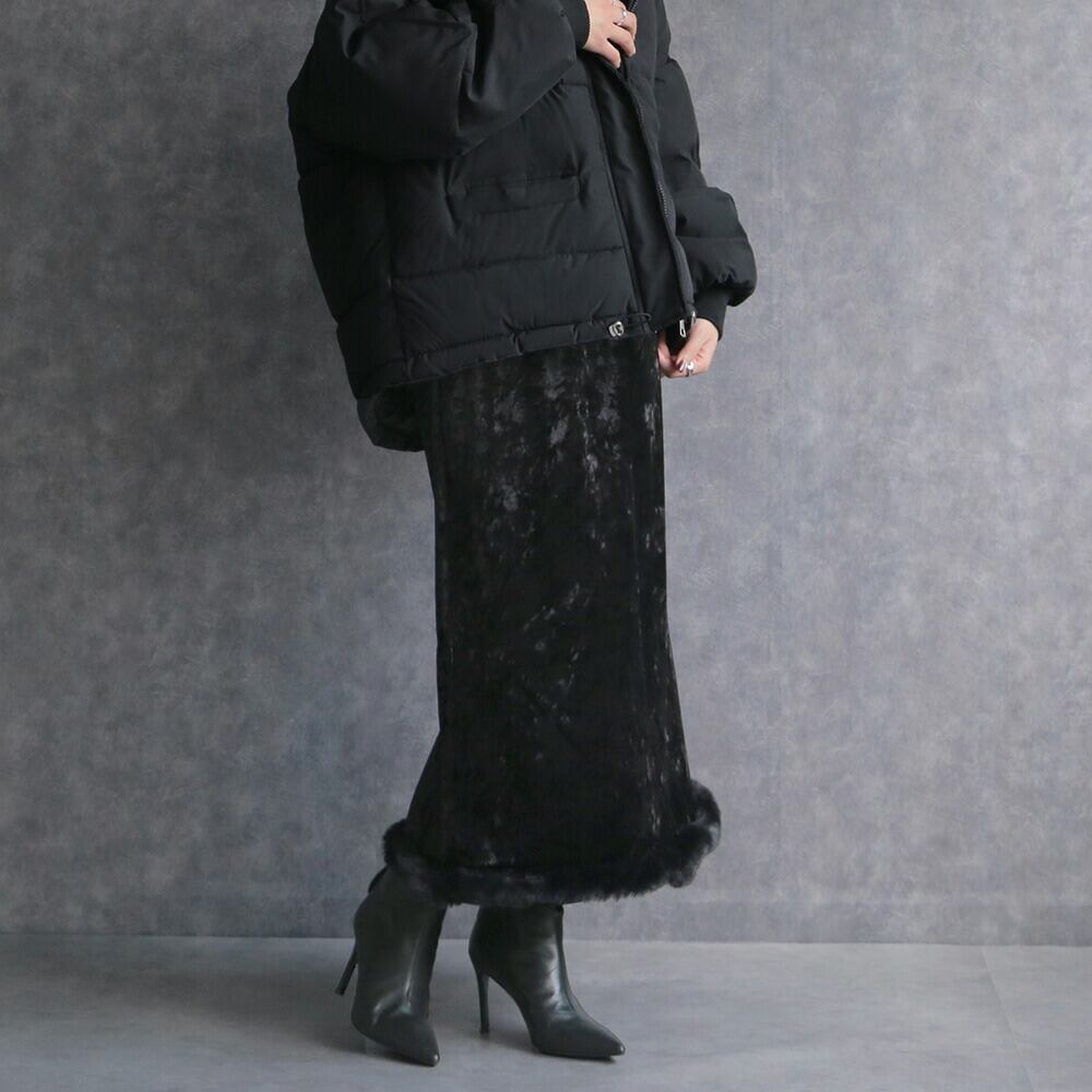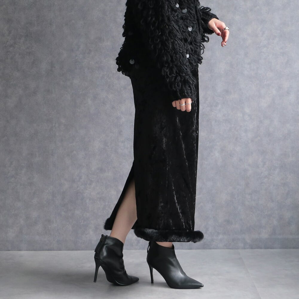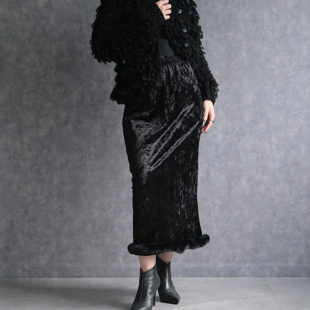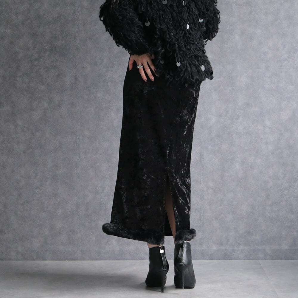 ロングスカート ベロア ナロースカート 裾ファー 光沢 きれいめ 上品 大人 女性 クリスマス デート 冬
