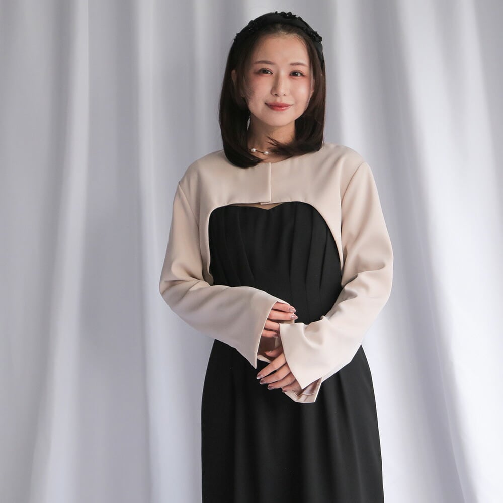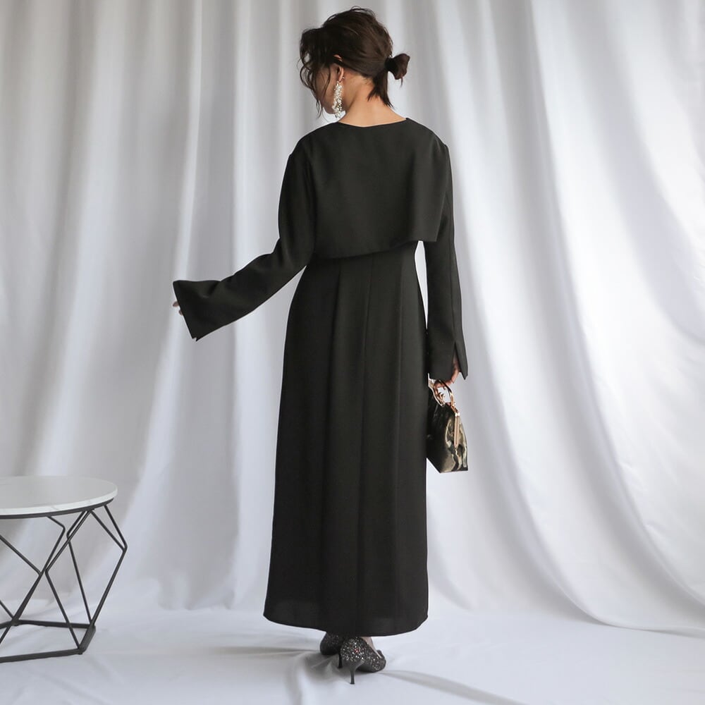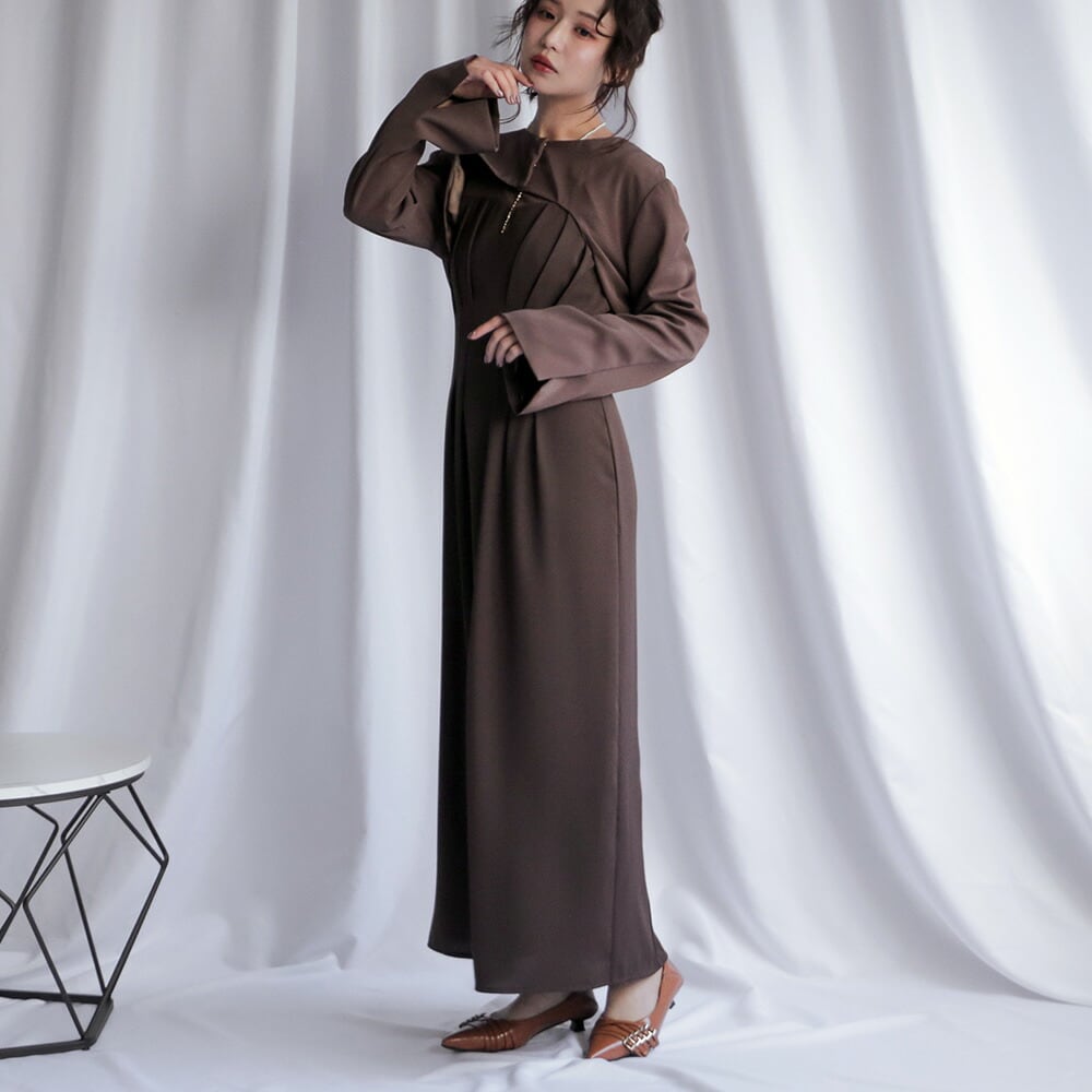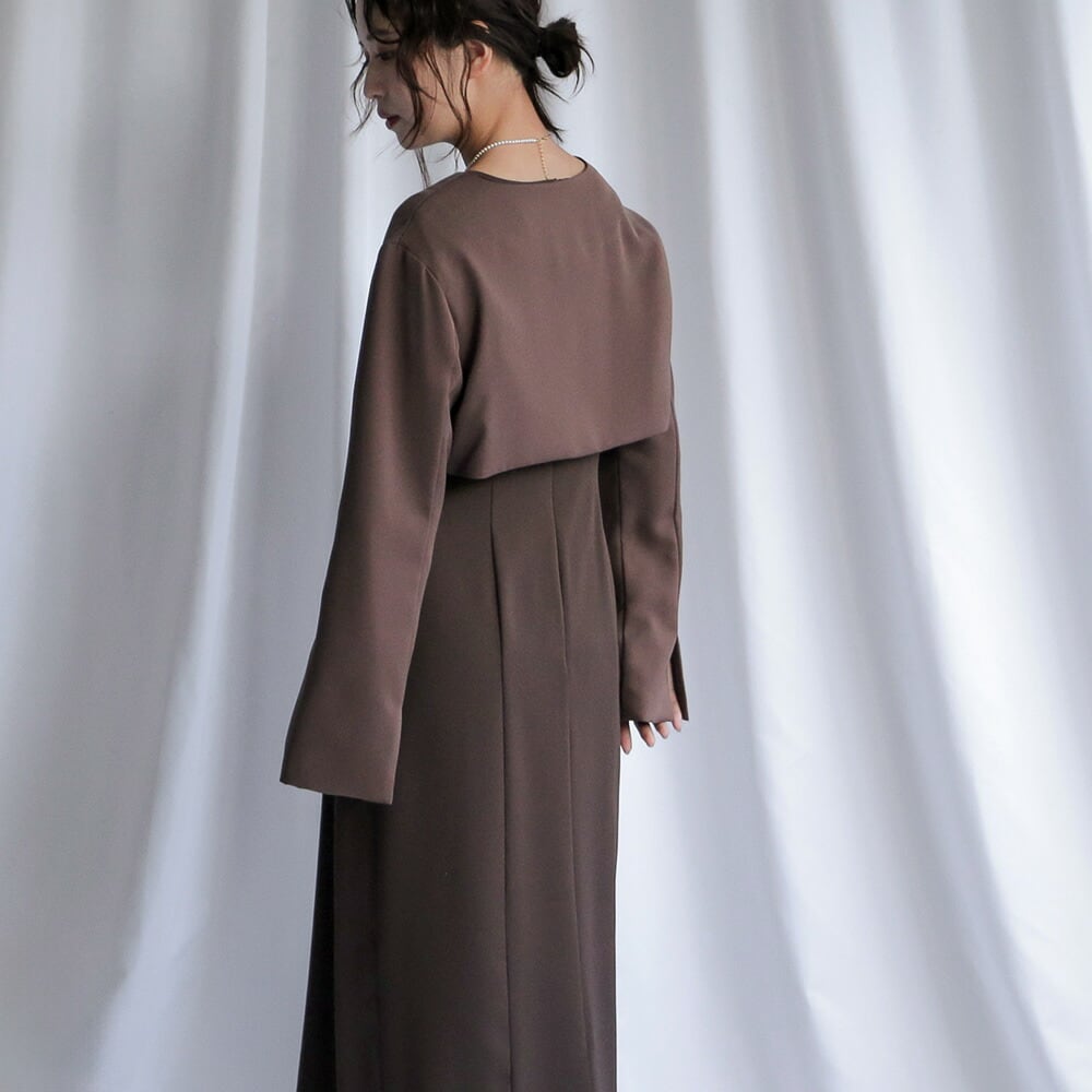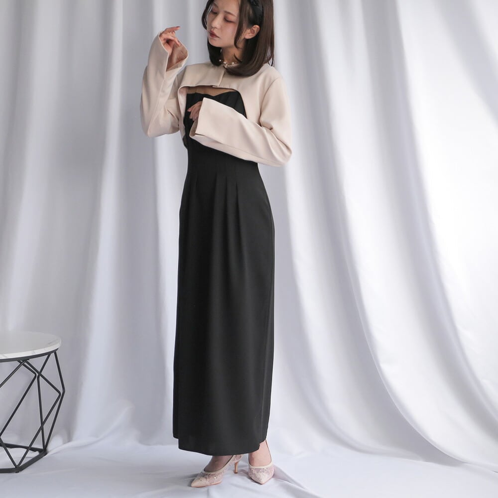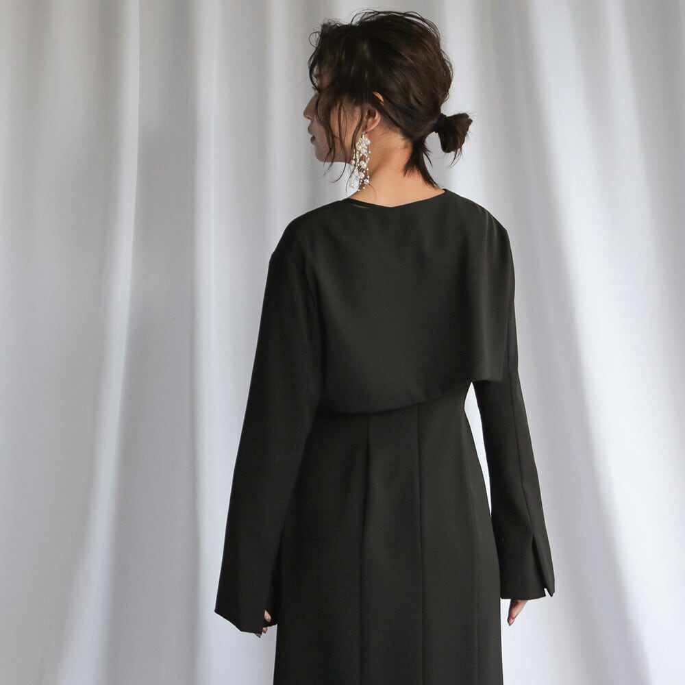 クロップド丈のジャケットがウエスト位置を高く見せ、ドレスのタックシルエットをより美しく引き立てます。