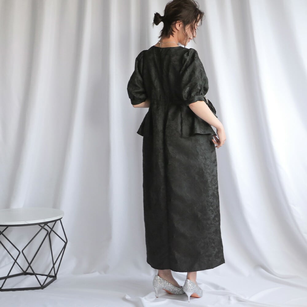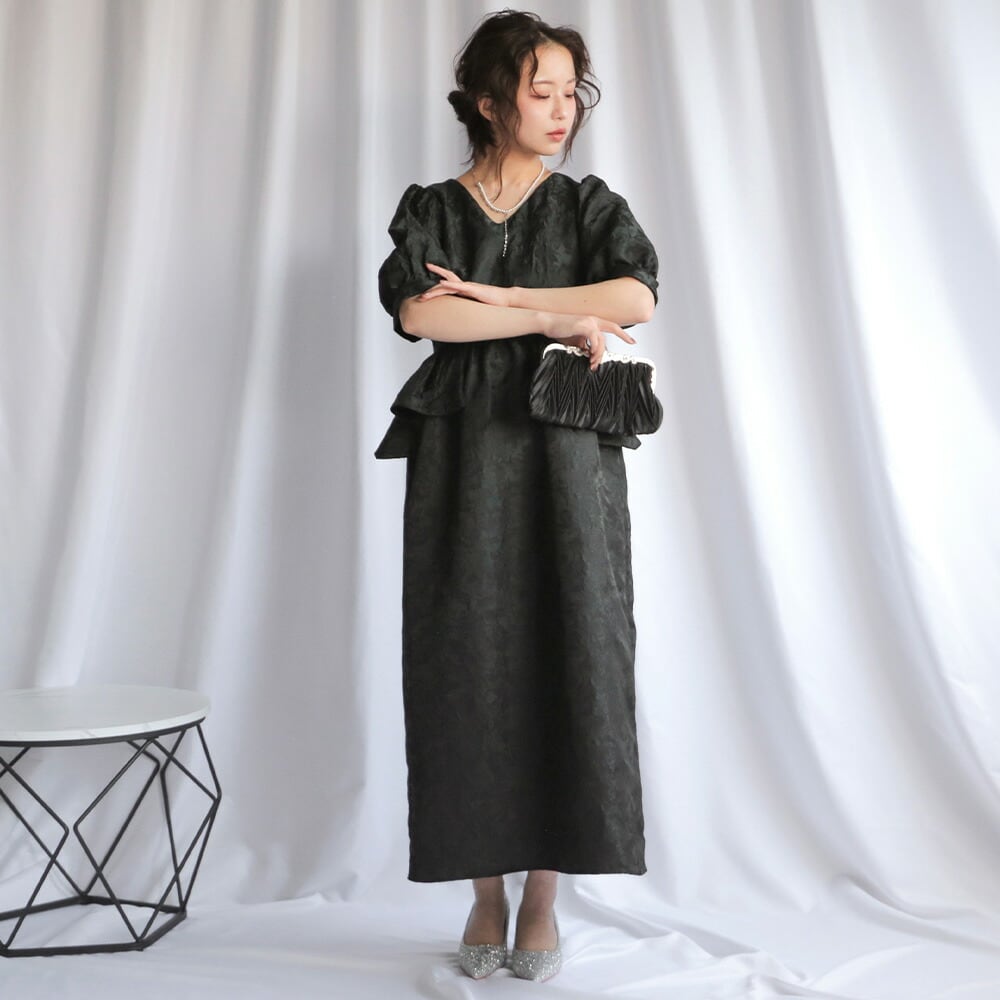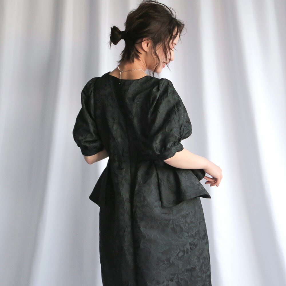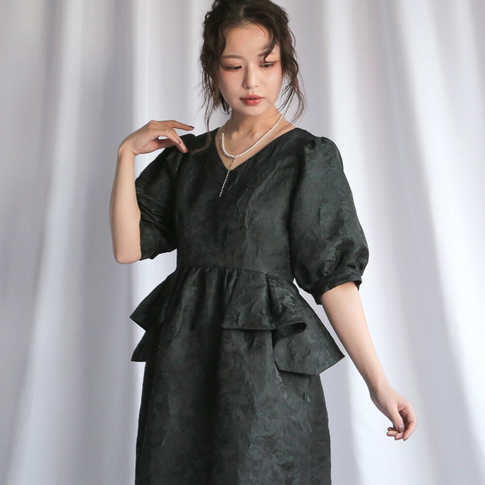 重厚感のあるジャガード生地が生み出す立体的な表情に、ペプラムをあしらったデザインドレス。