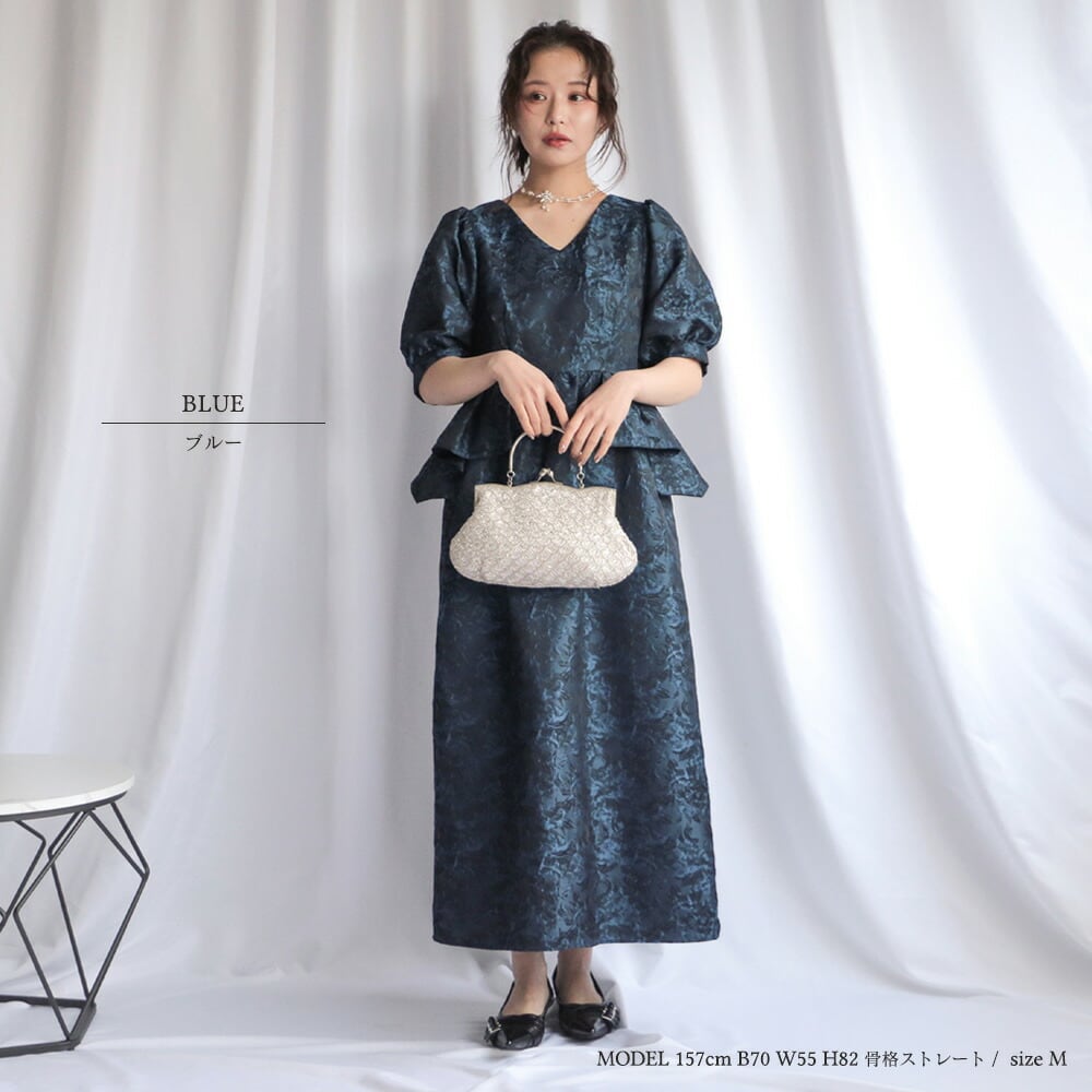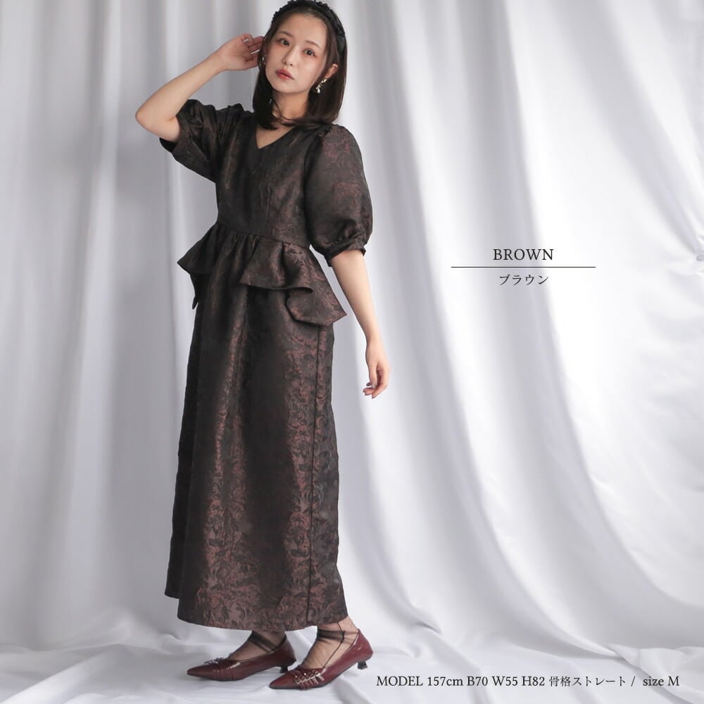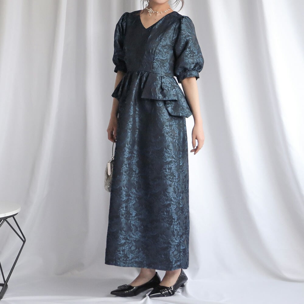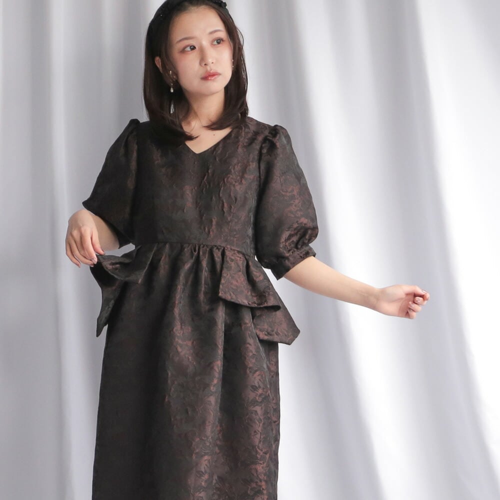 重厚感のあるジャガード生地が生み出す立体的な表情に、ペプラムをあしらったデザインドレス。