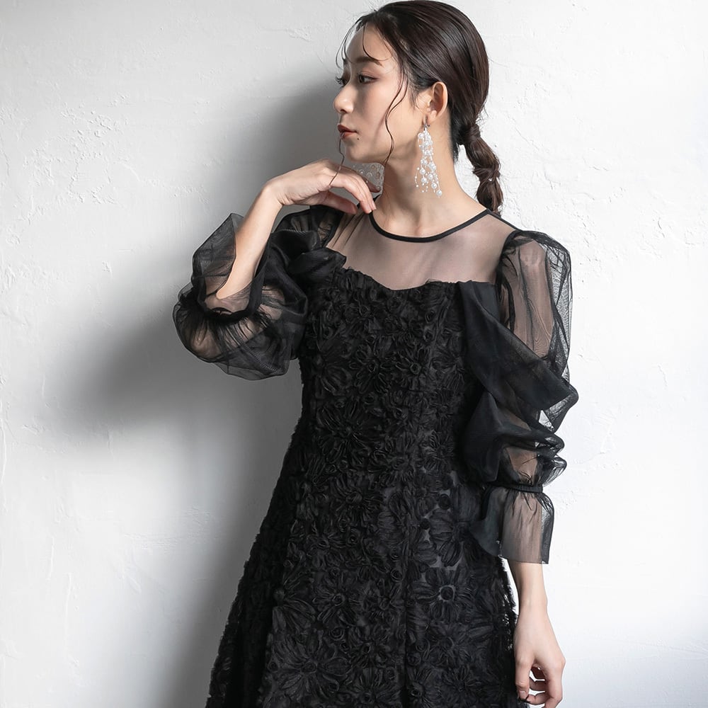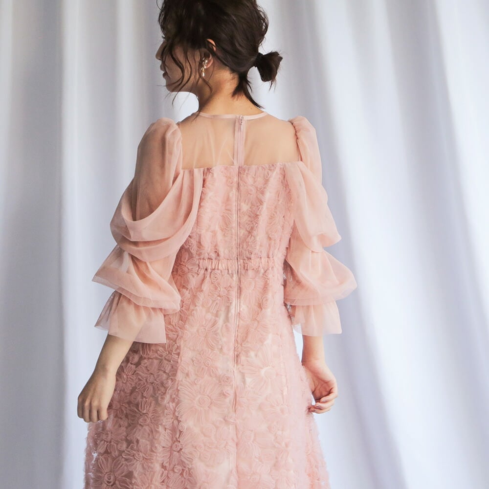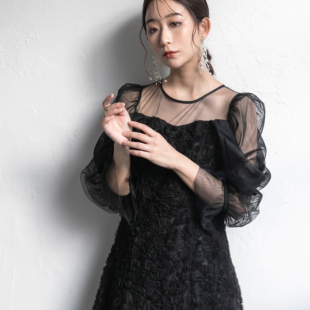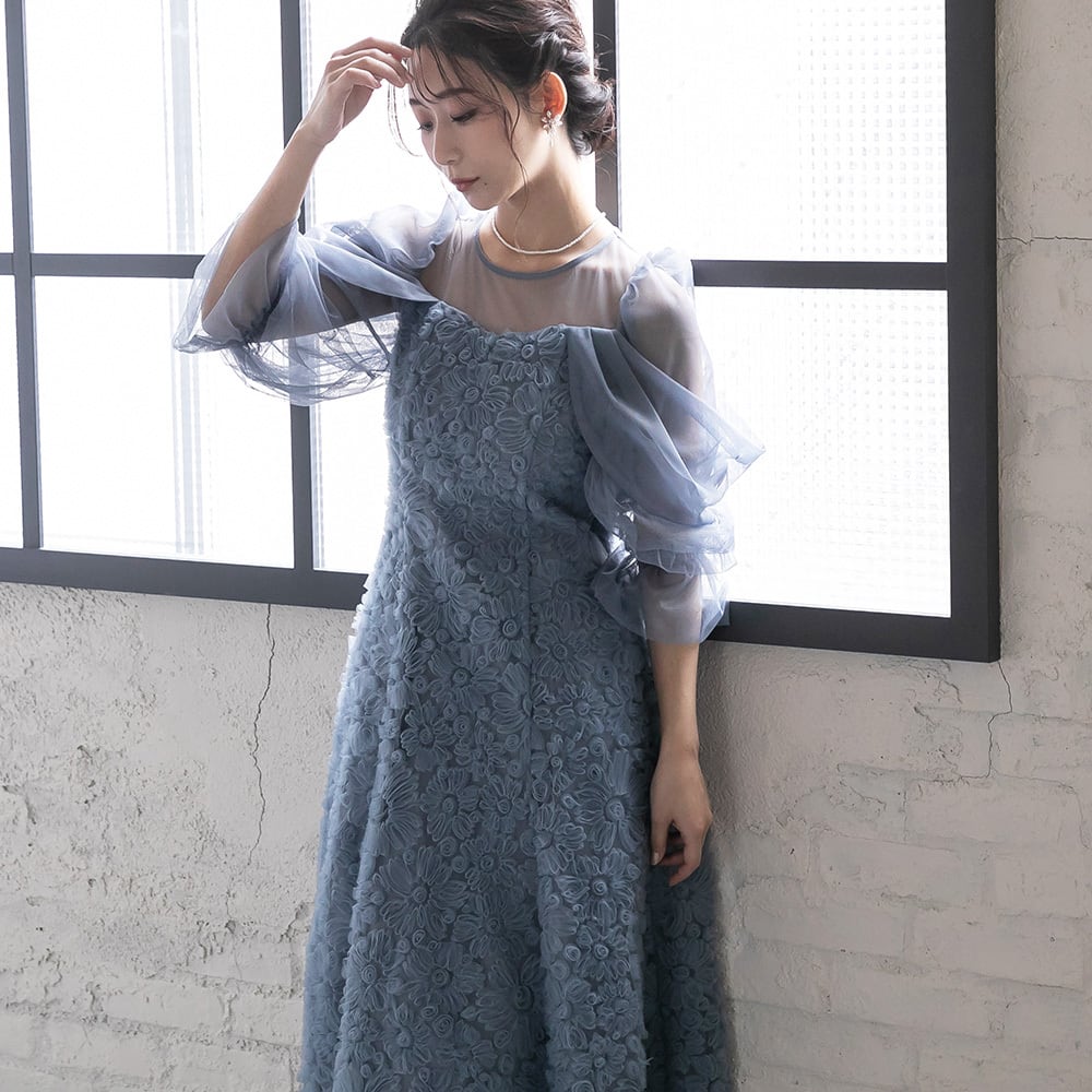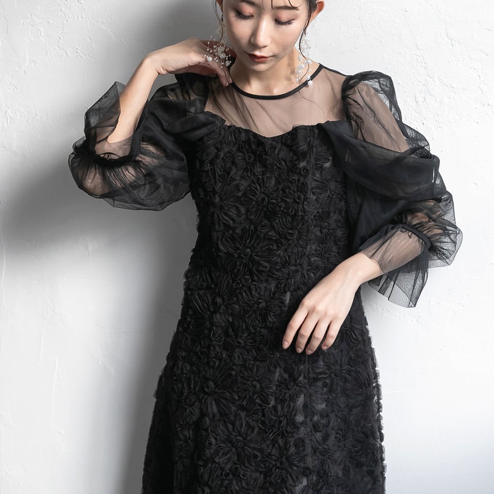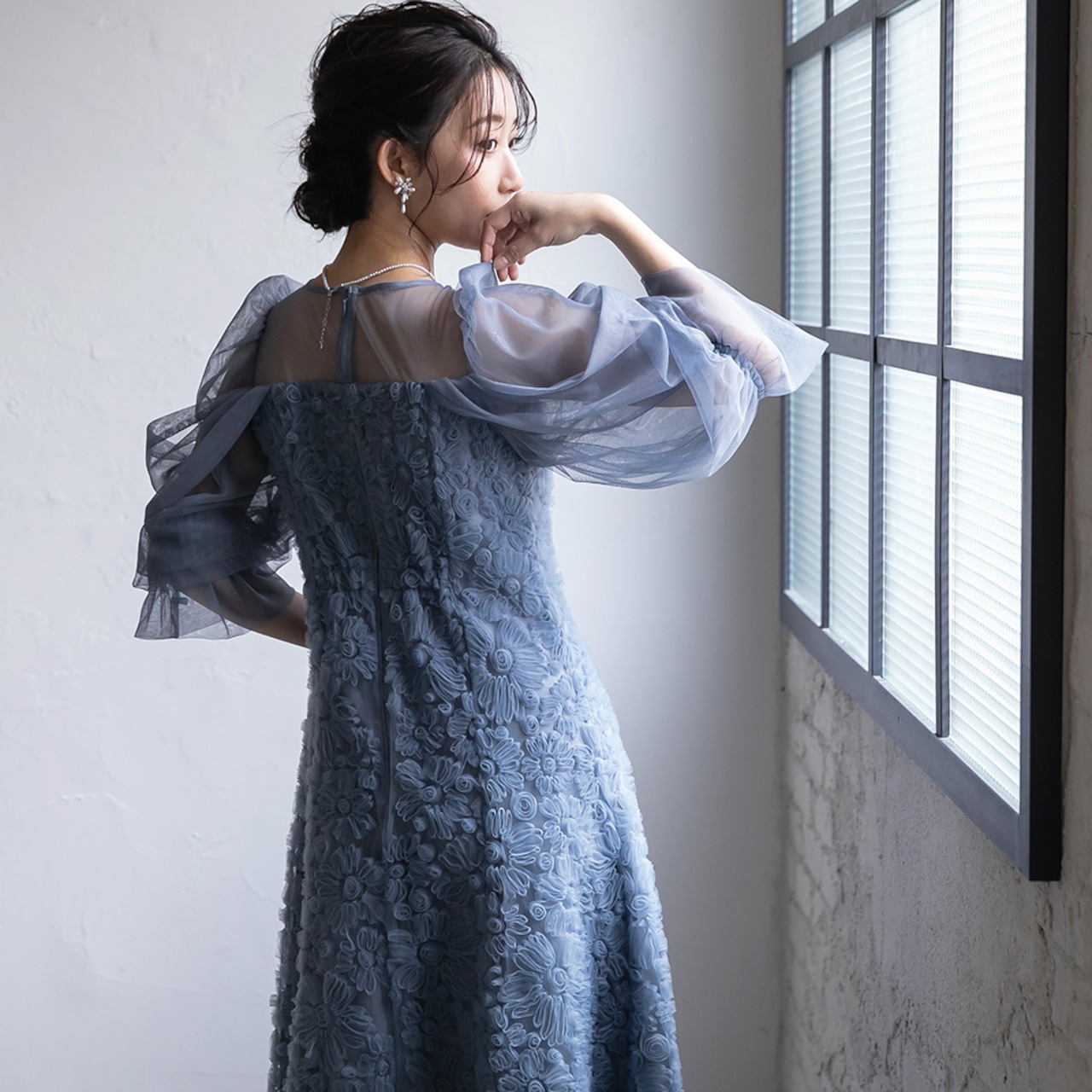 繊細なチュールを重ねたスリーブは、空気を含んだようなボリューム感で、装いに軽やかな華やぎを添えます。