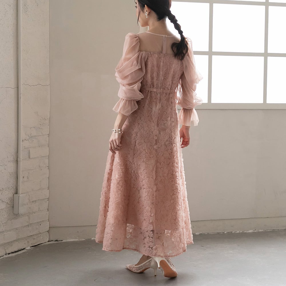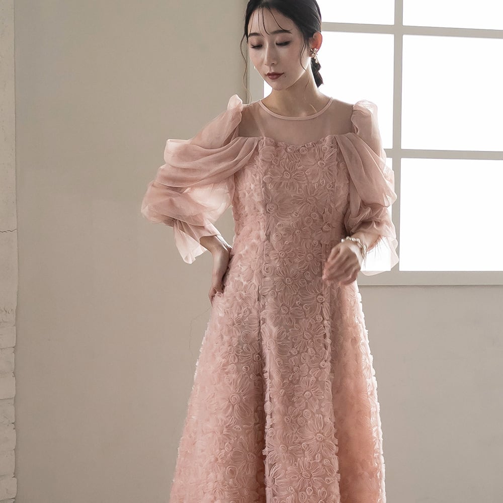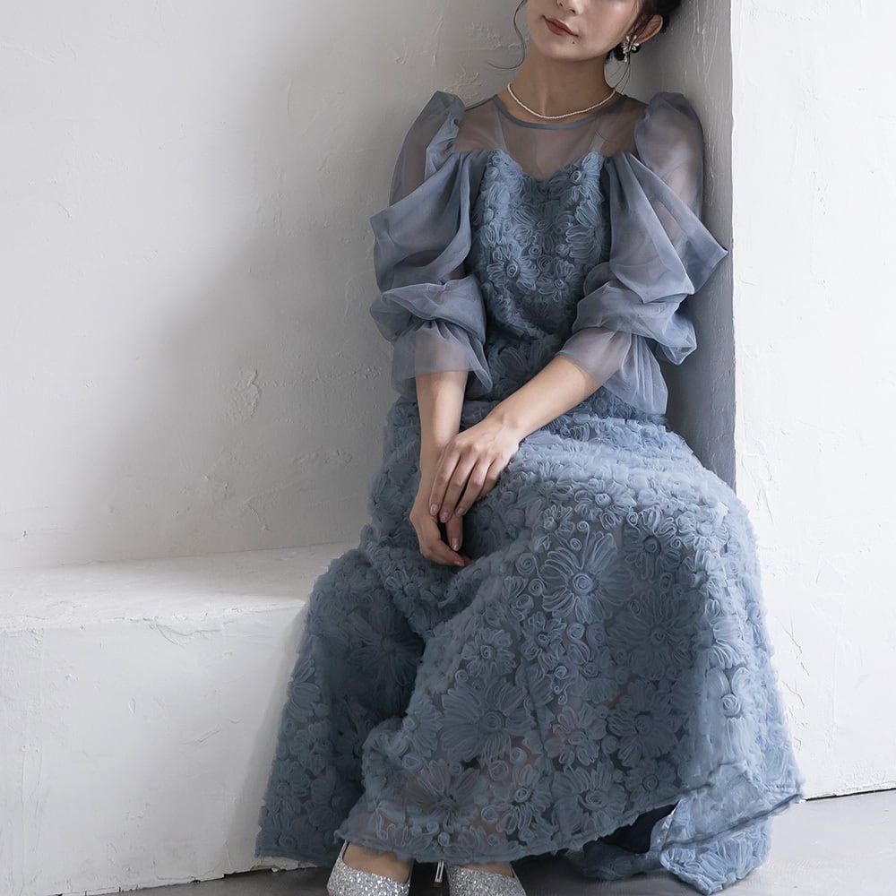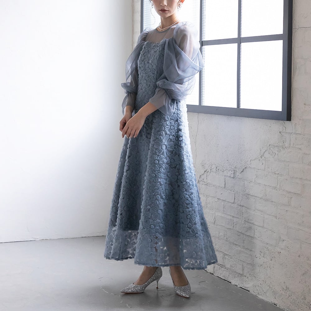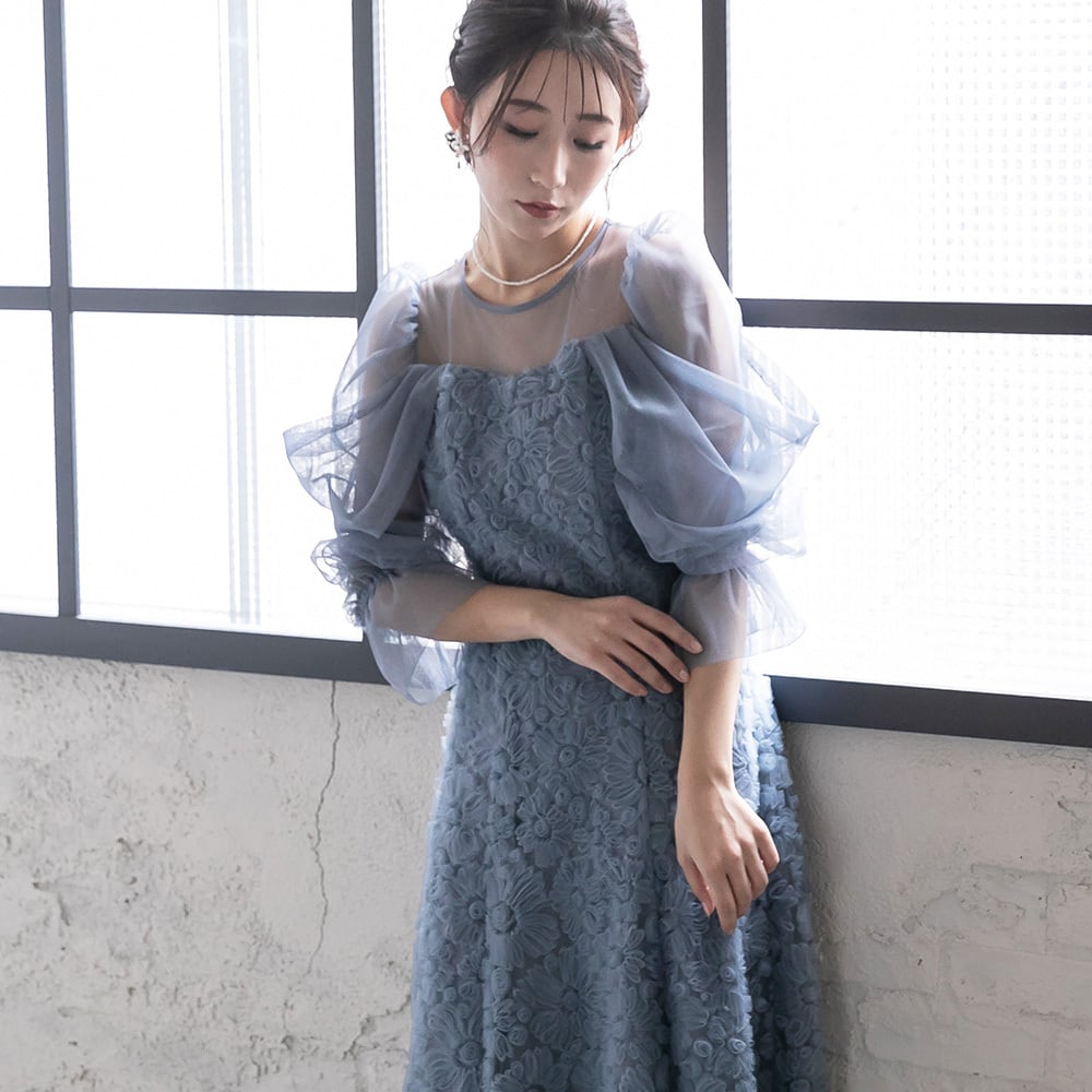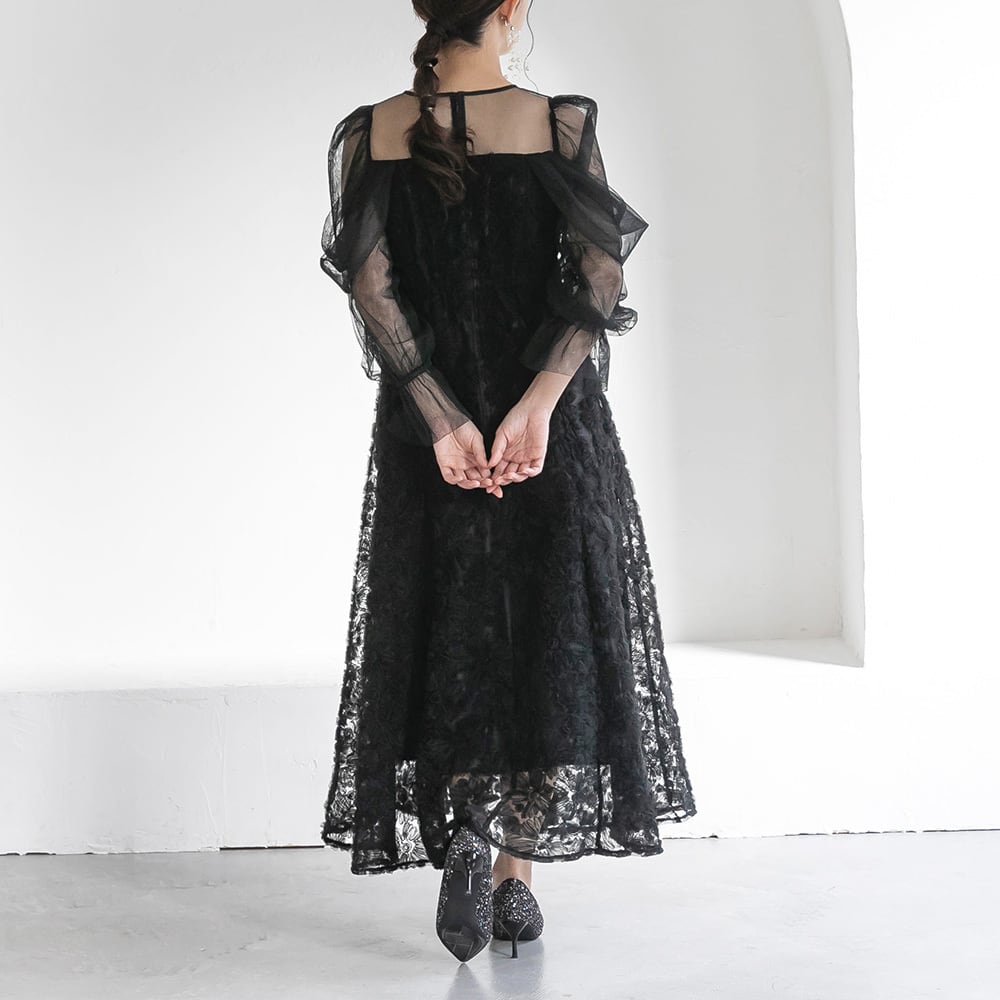 繊細なチュールを重ねたスリーブは、空気を含んだようなボリューム感で、装いに軽やかな華やぎを添えます。