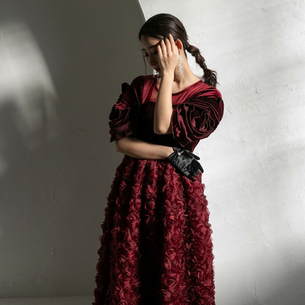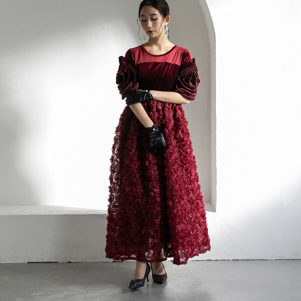 ベロア パーティー ドレス 赤 立体ローズ レトロ クラシカル 花柄 ベルベット ホリデーパーティー 舞台挨拶 謝恩会 同窓会 フォーマルドレス 10代 20代 30代