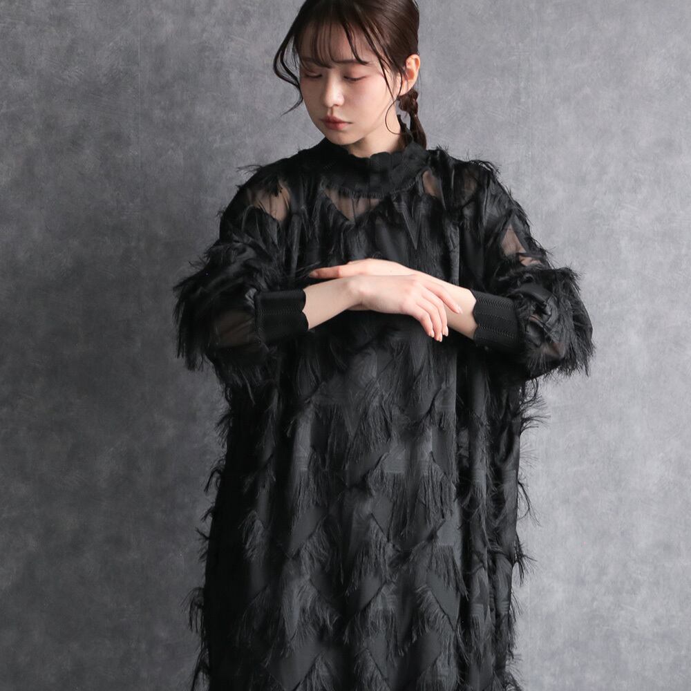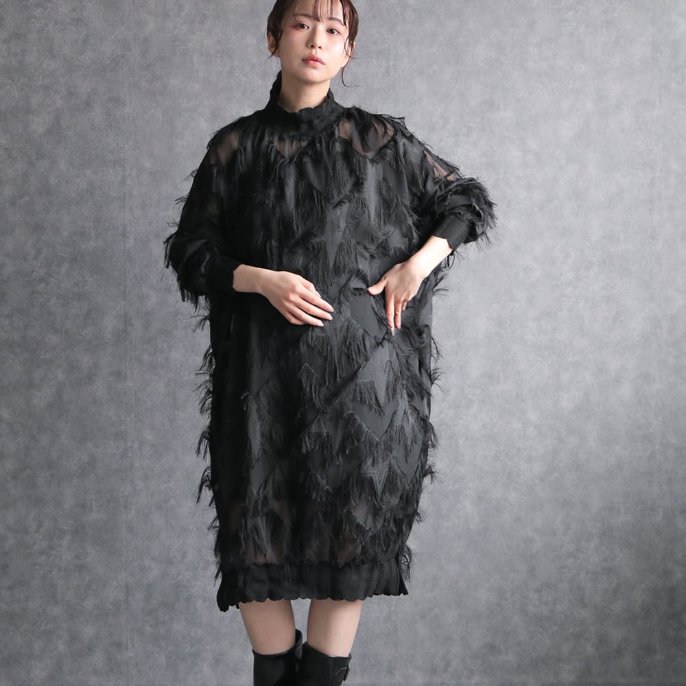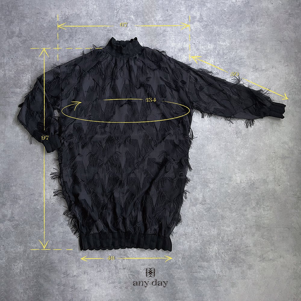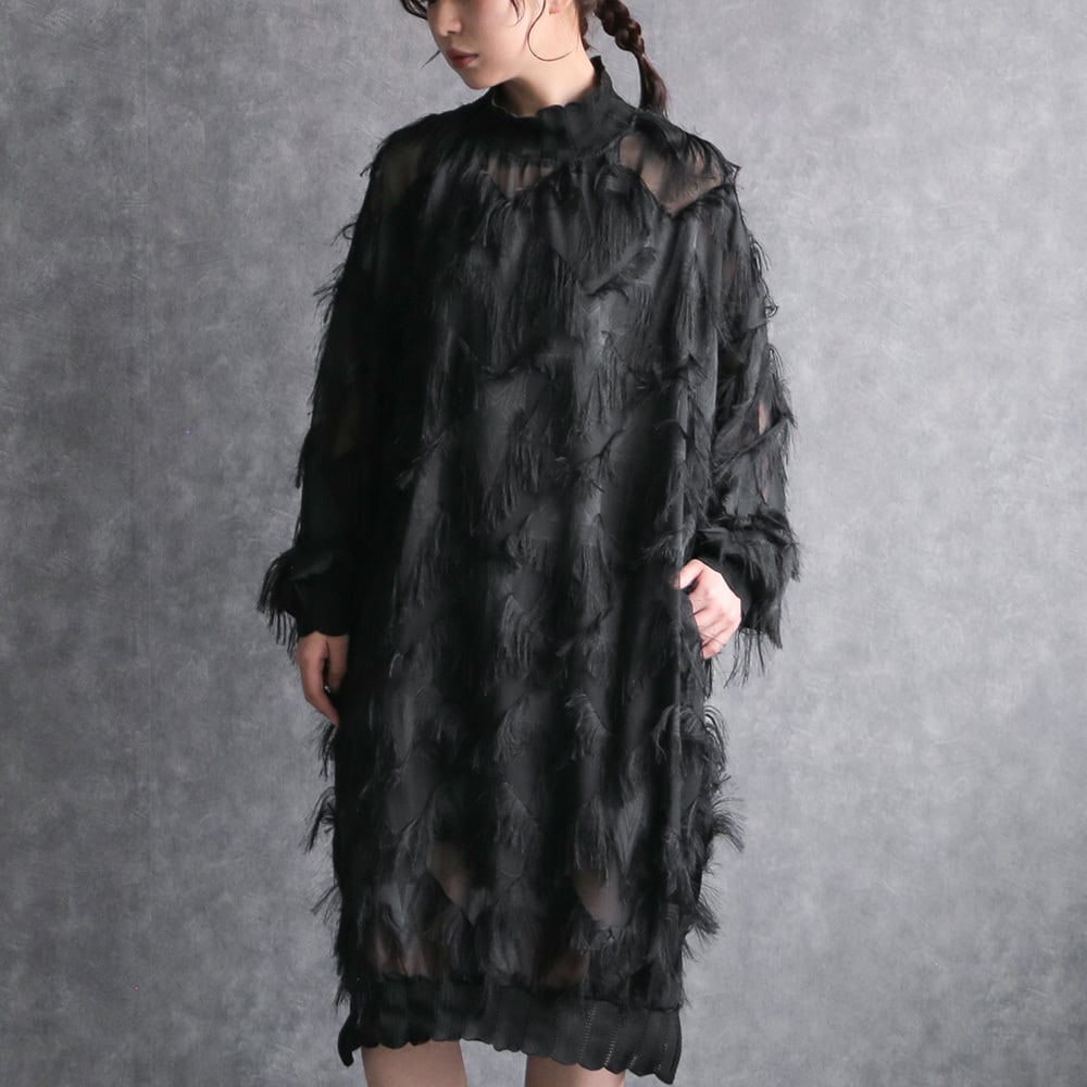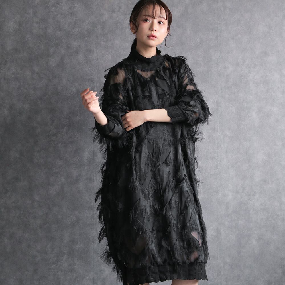 330120 any day エニーデイ ワンピース フリンジ シアーワンピース 黒 長袖 シアー レース チュニック モックネック ひざ丈 ポケット付き ドロップショルダー コクーン 個性的 モード系 レディース 大人 送料無料