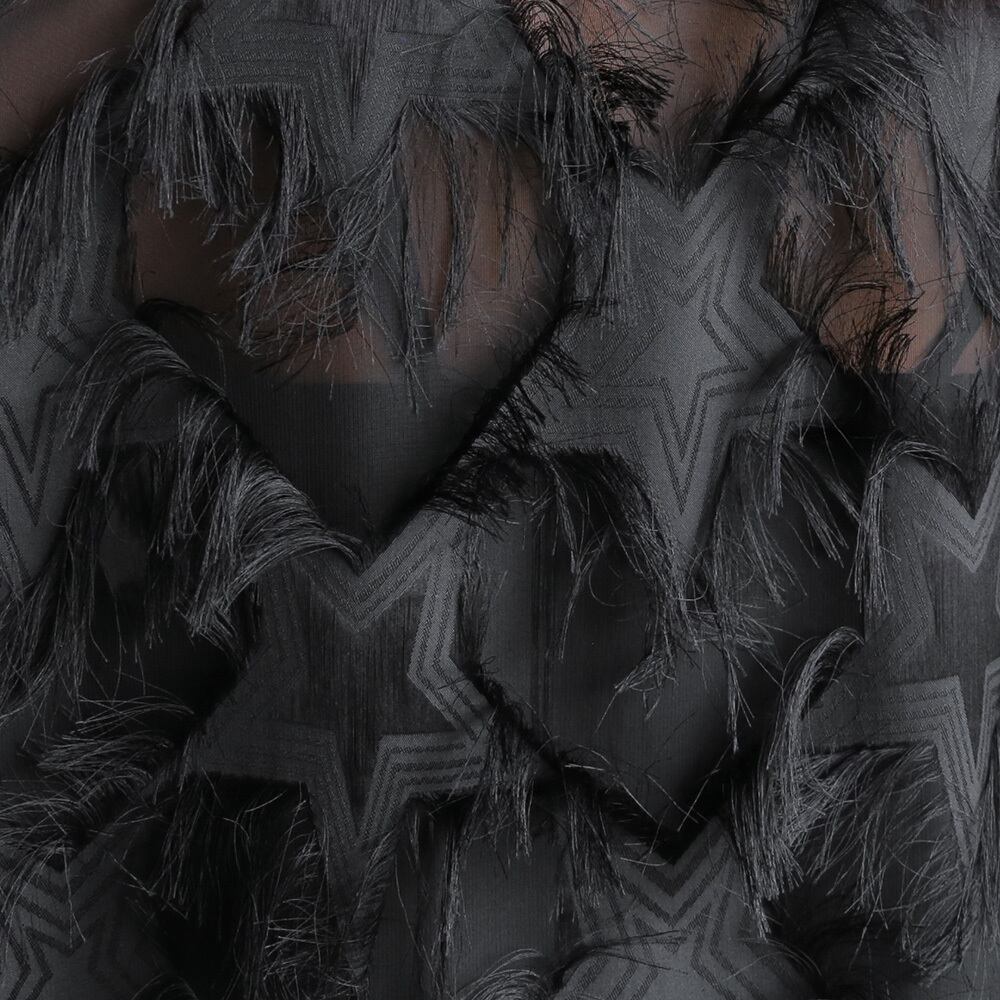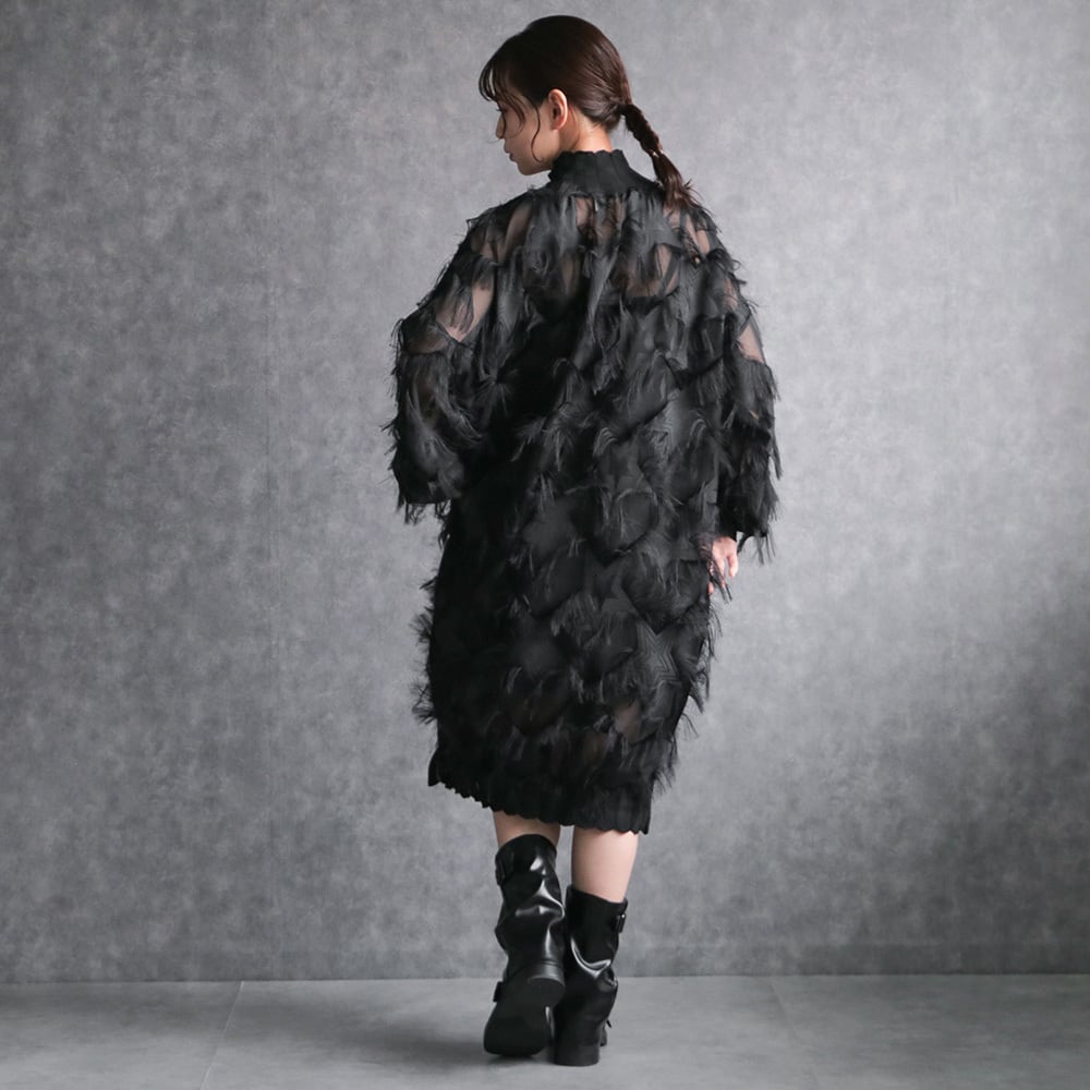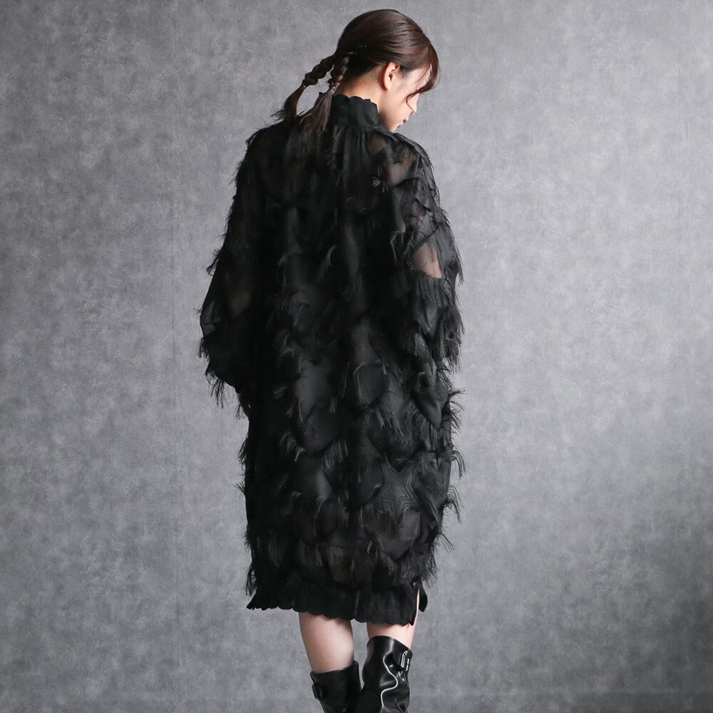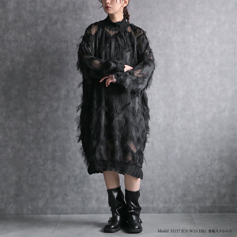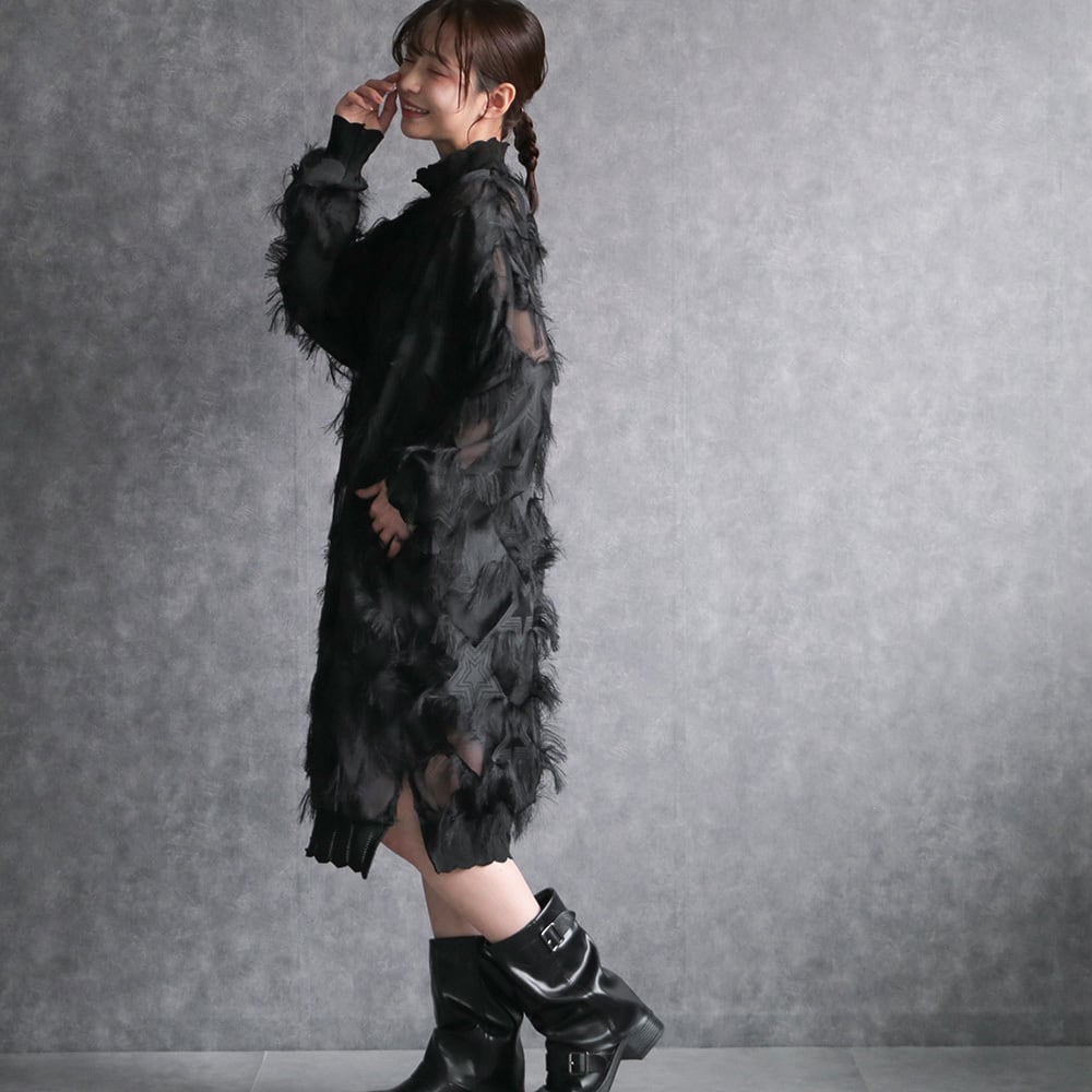 330120 any day エニーデイ ワンピース フリンジ シアーワンピース 黒 長袖 シアー レース チュニック モックネック ひざ丈 ポケット付き ドロップショルダー コクーン 個性的 モード系 レディース 大人 送料無料