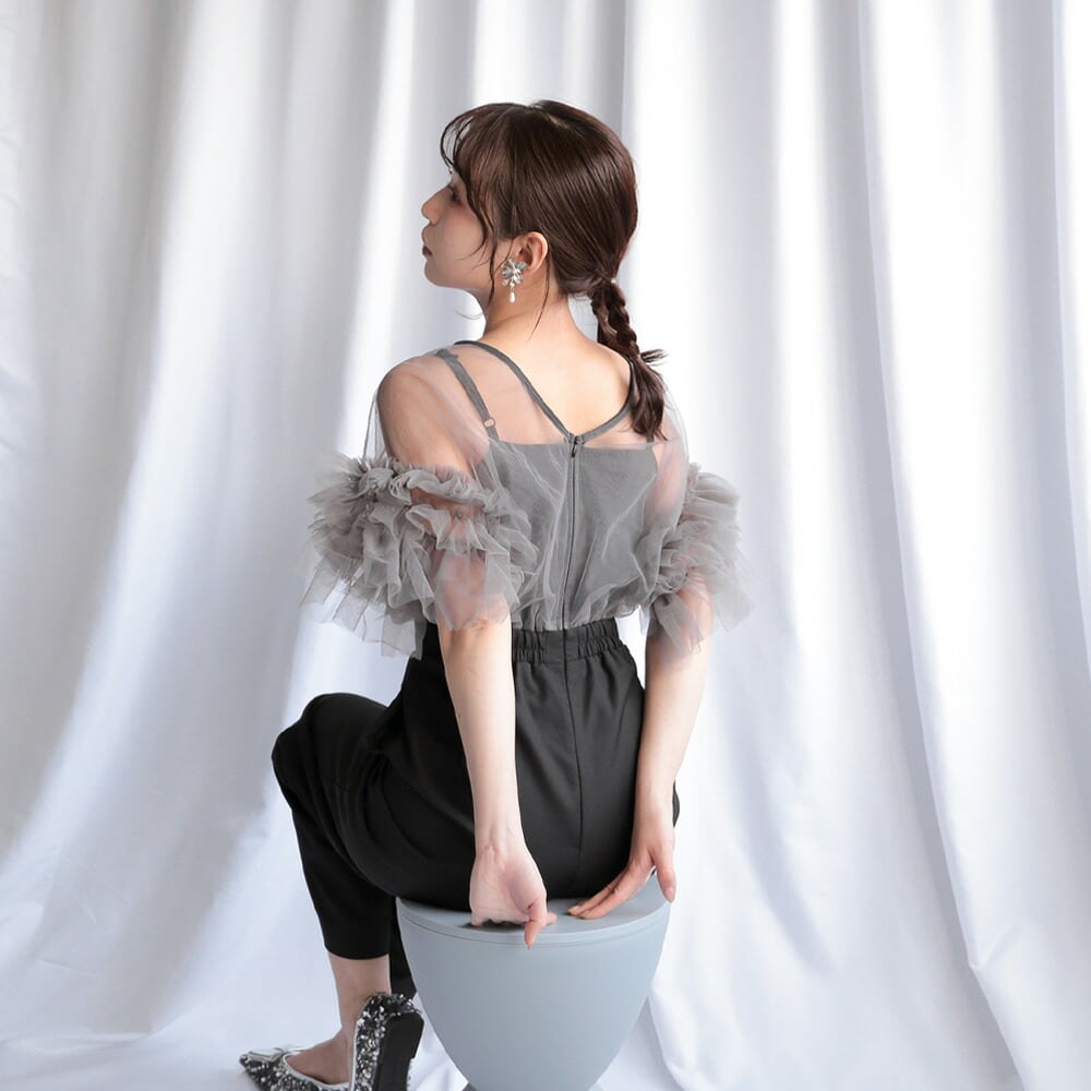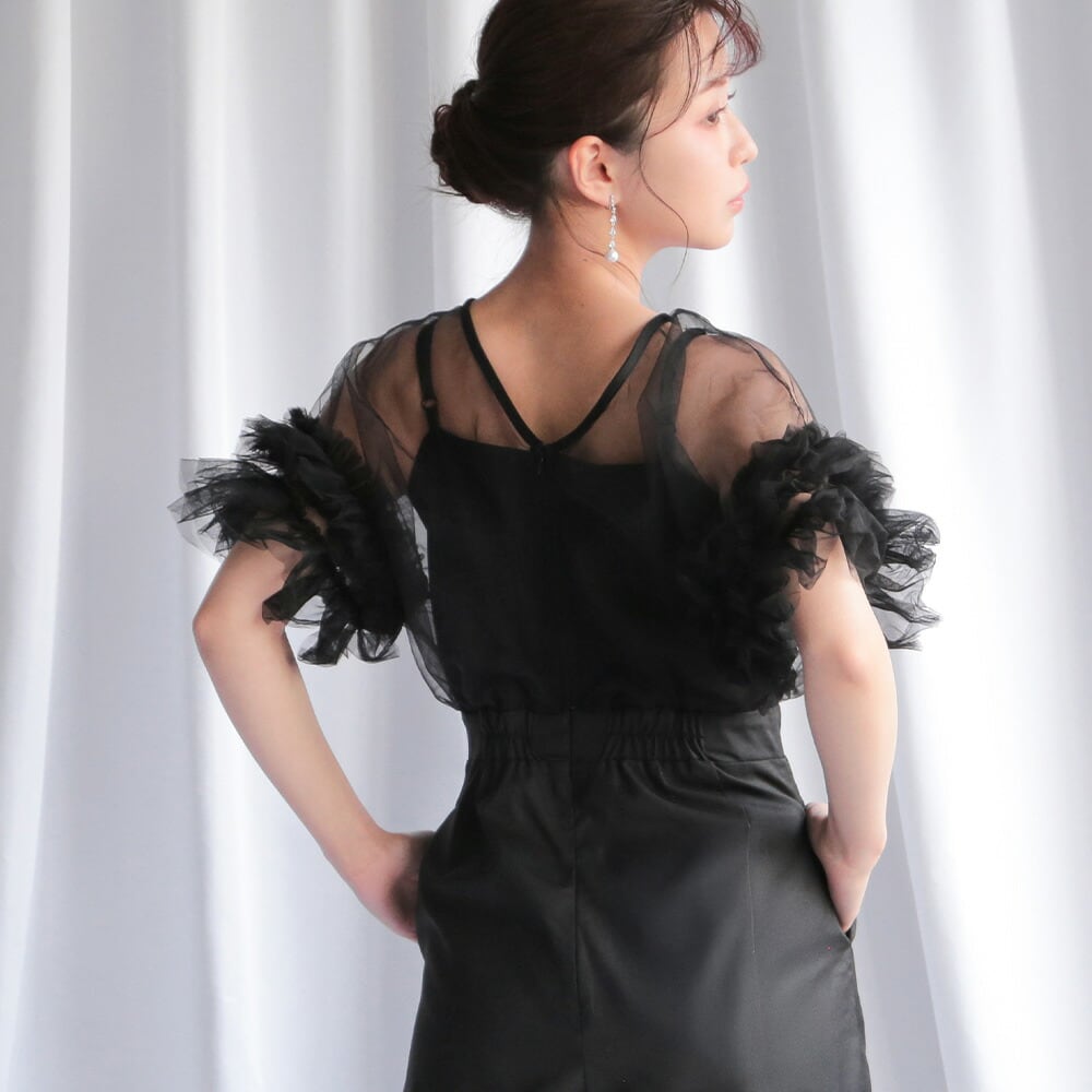 二の腕を上品にカバーしながら、デコルテ周りはすっきりとシャープに。