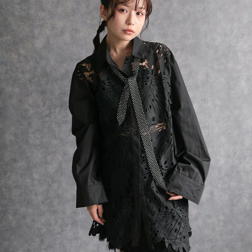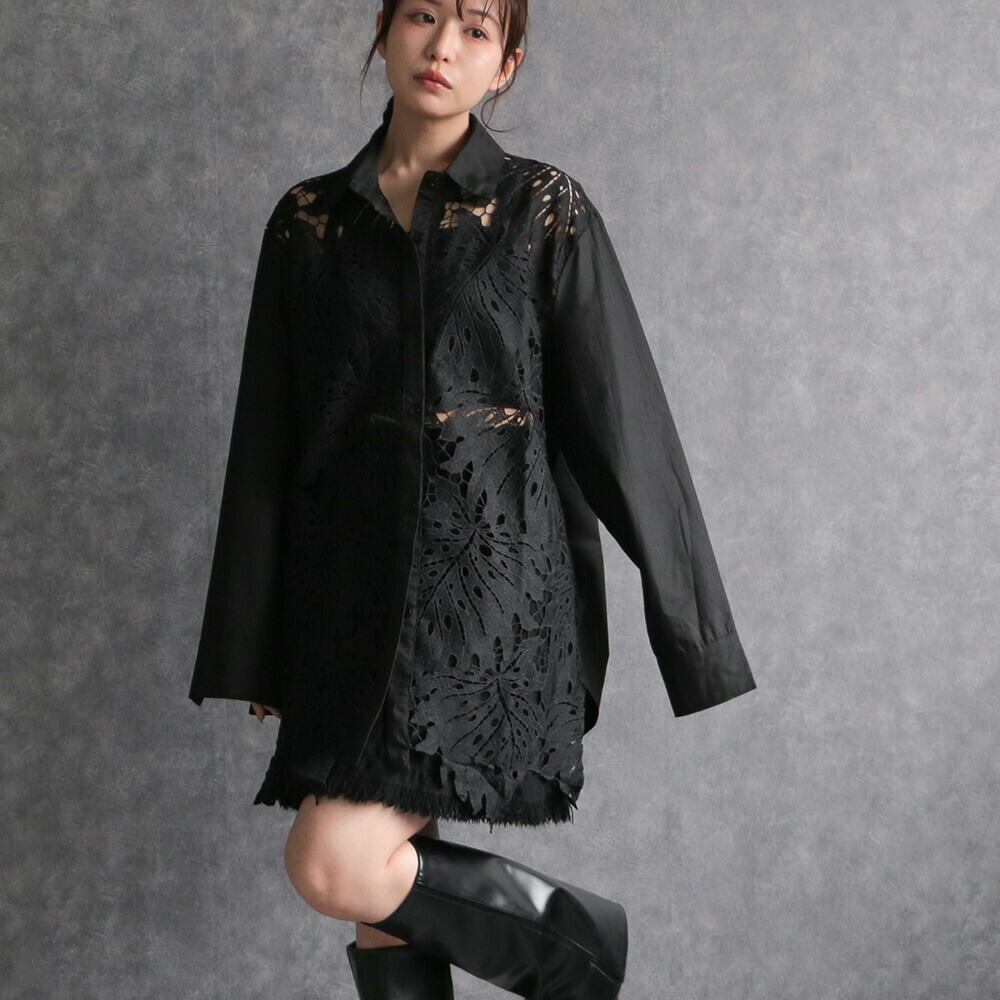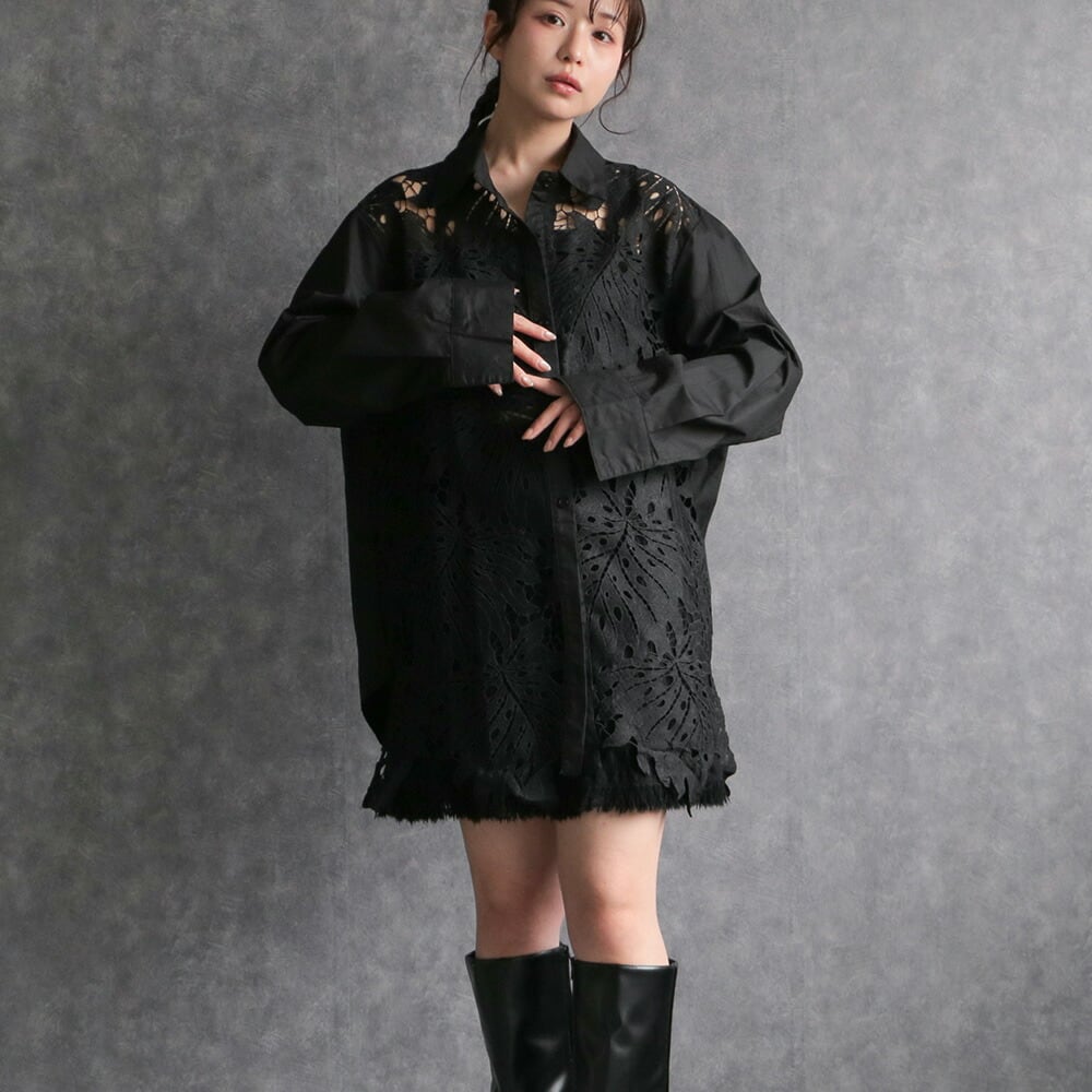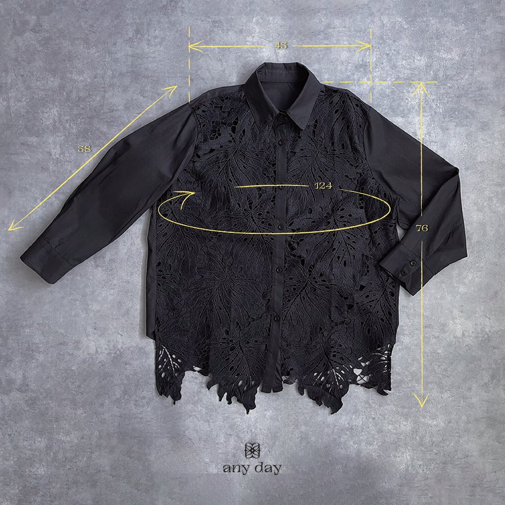 330126 any day エニーデイ シャツ レディース 長袖 コットン レース レースシャツ ブラウス トップス ロングシャツ オーバーサイズ 黒 ブラック チュニック 衣装 カジュアル 送料無料