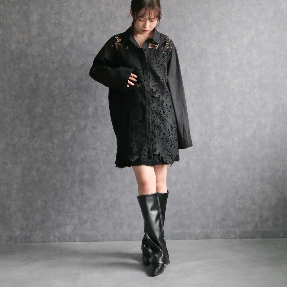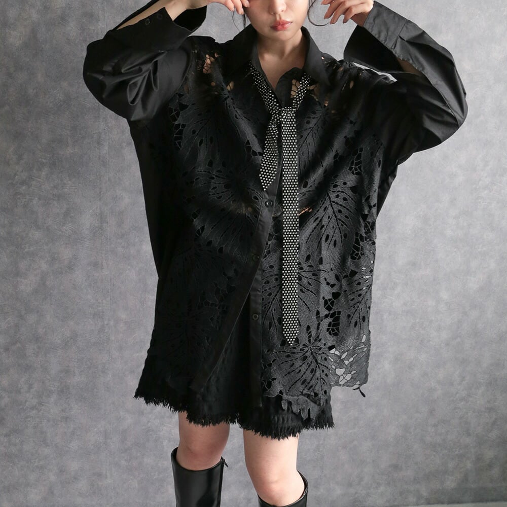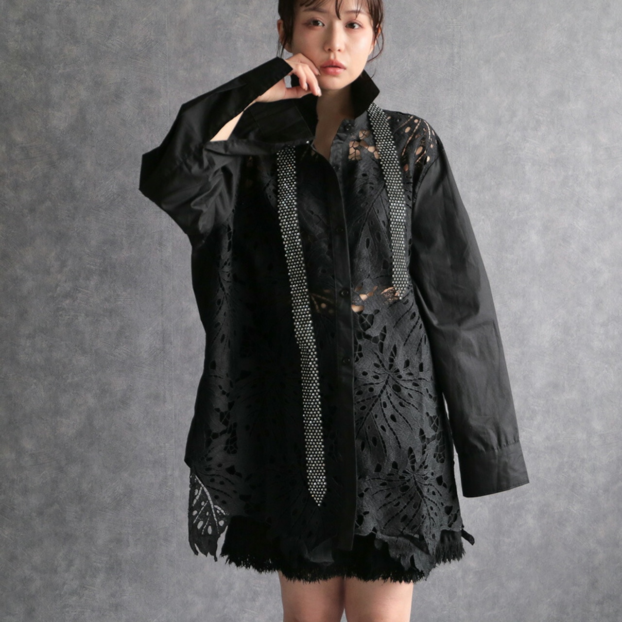 330126 any day エニーデイ シャツ レディース 長袖 コットン レース レースシャツ ブラウス トップス ロングシャツ オーバーサイズ 黒 ブラック チュニック 衣装 カジュアル 送料無料