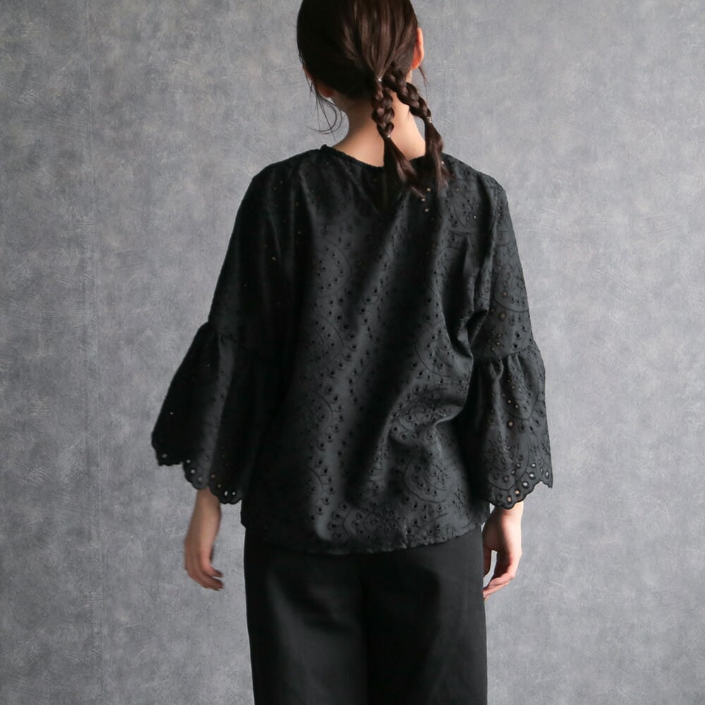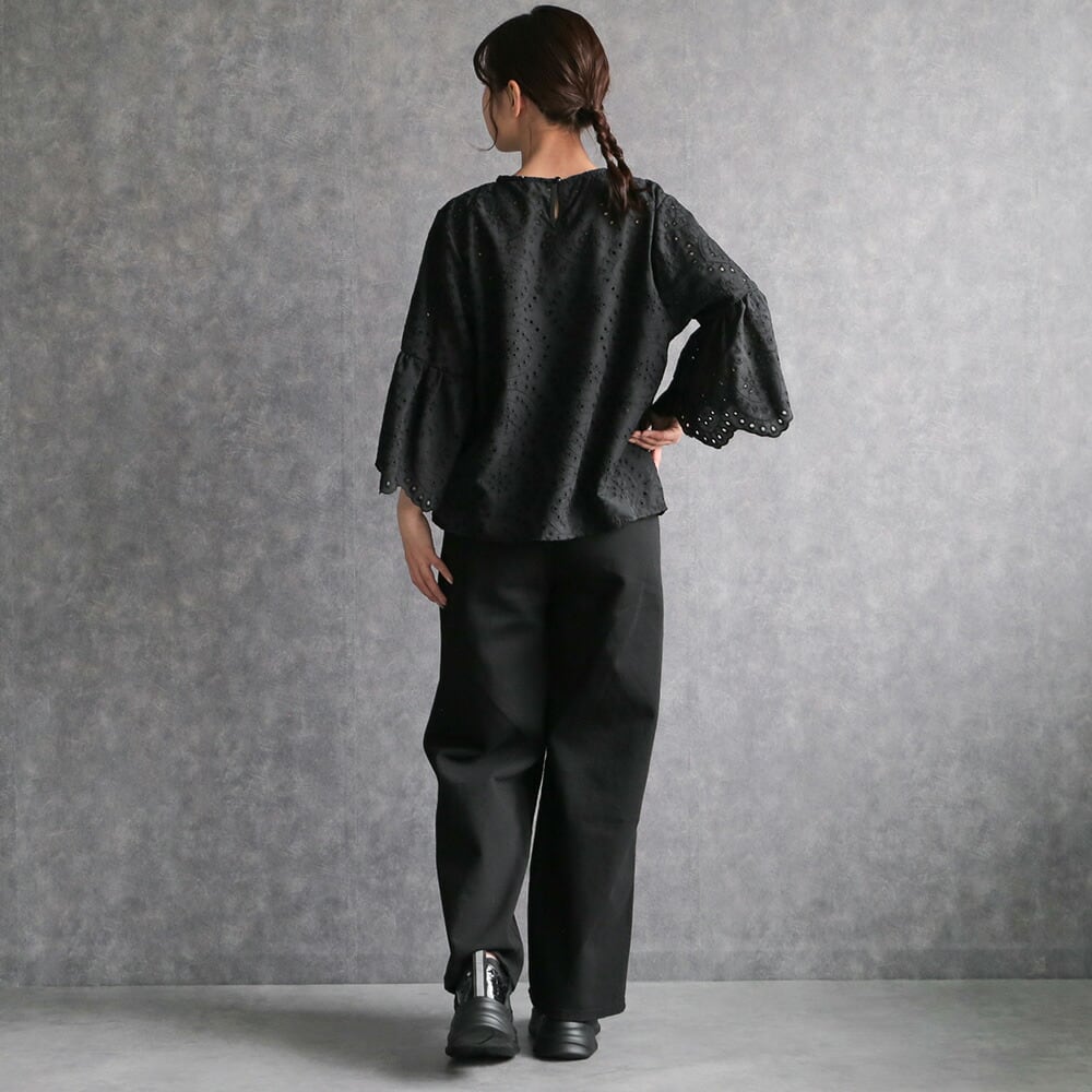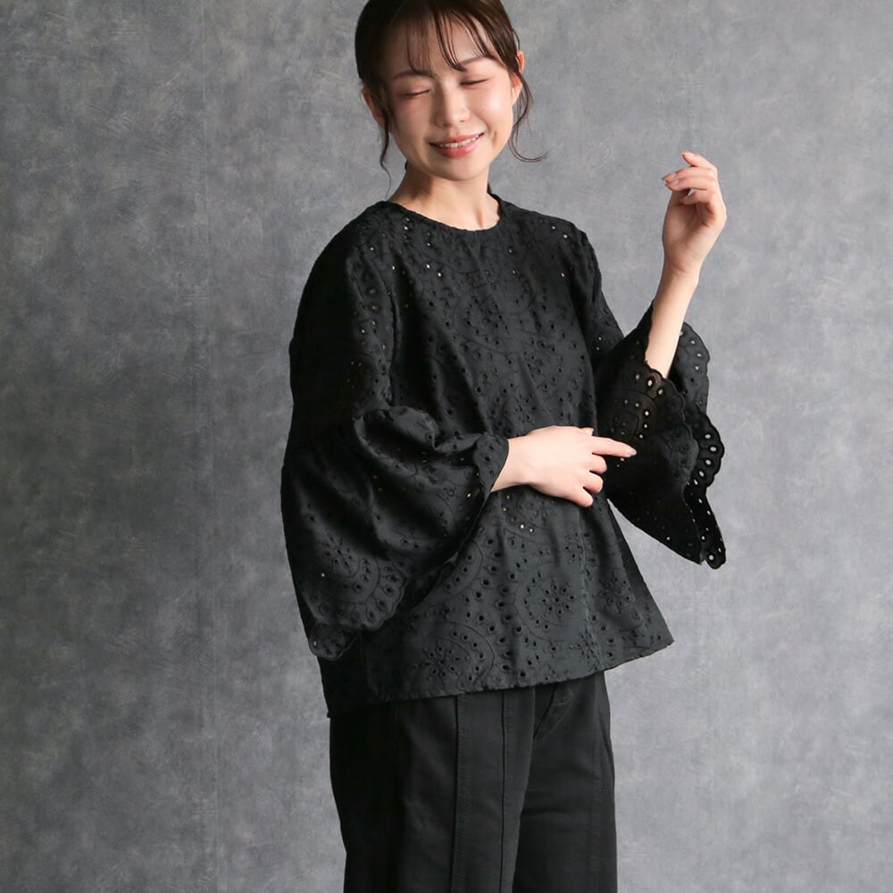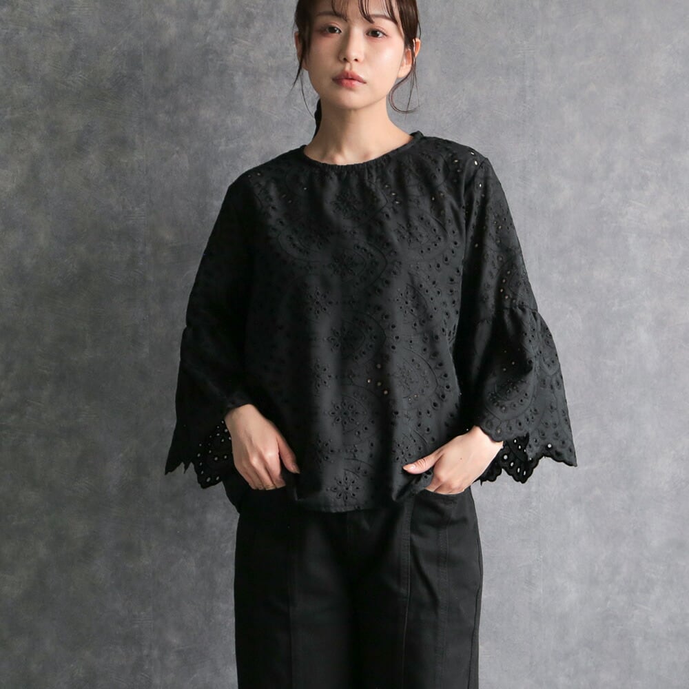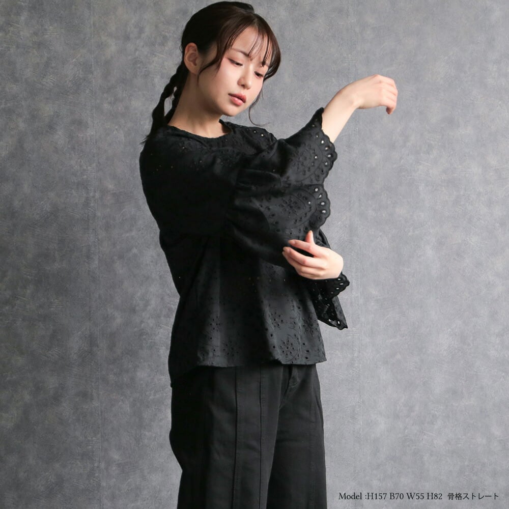 330128 any day エニーデイ 綿100% ブラウス シャツ コットン トップス 刺繍 レース スカラップ 黒 ブラック レディース 七分袖 体型カバー ゆったり 春 夏 20代 30代 40代 送料無料