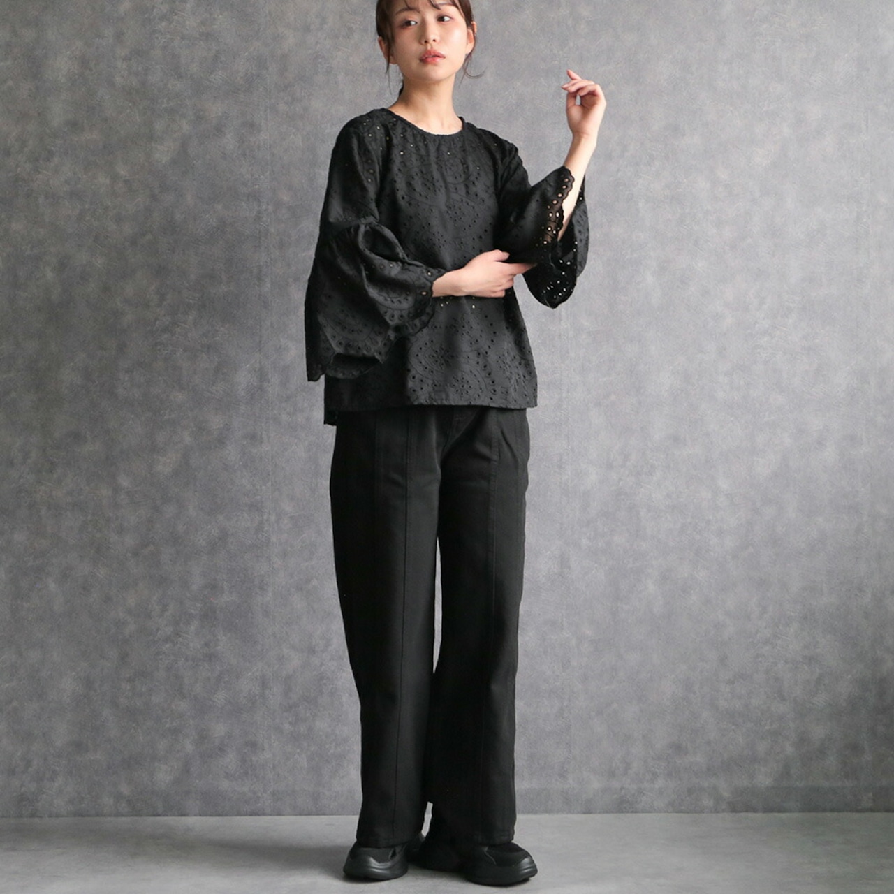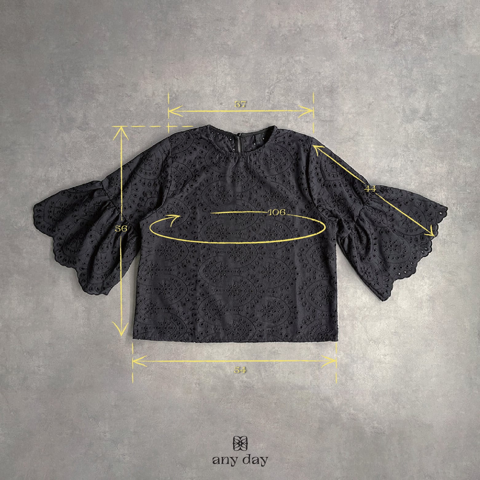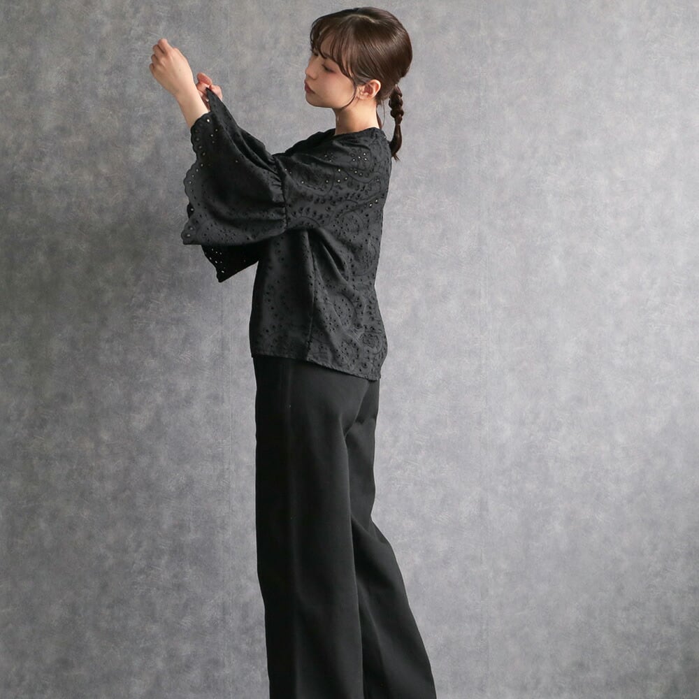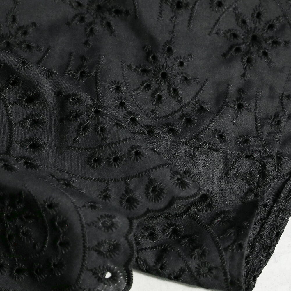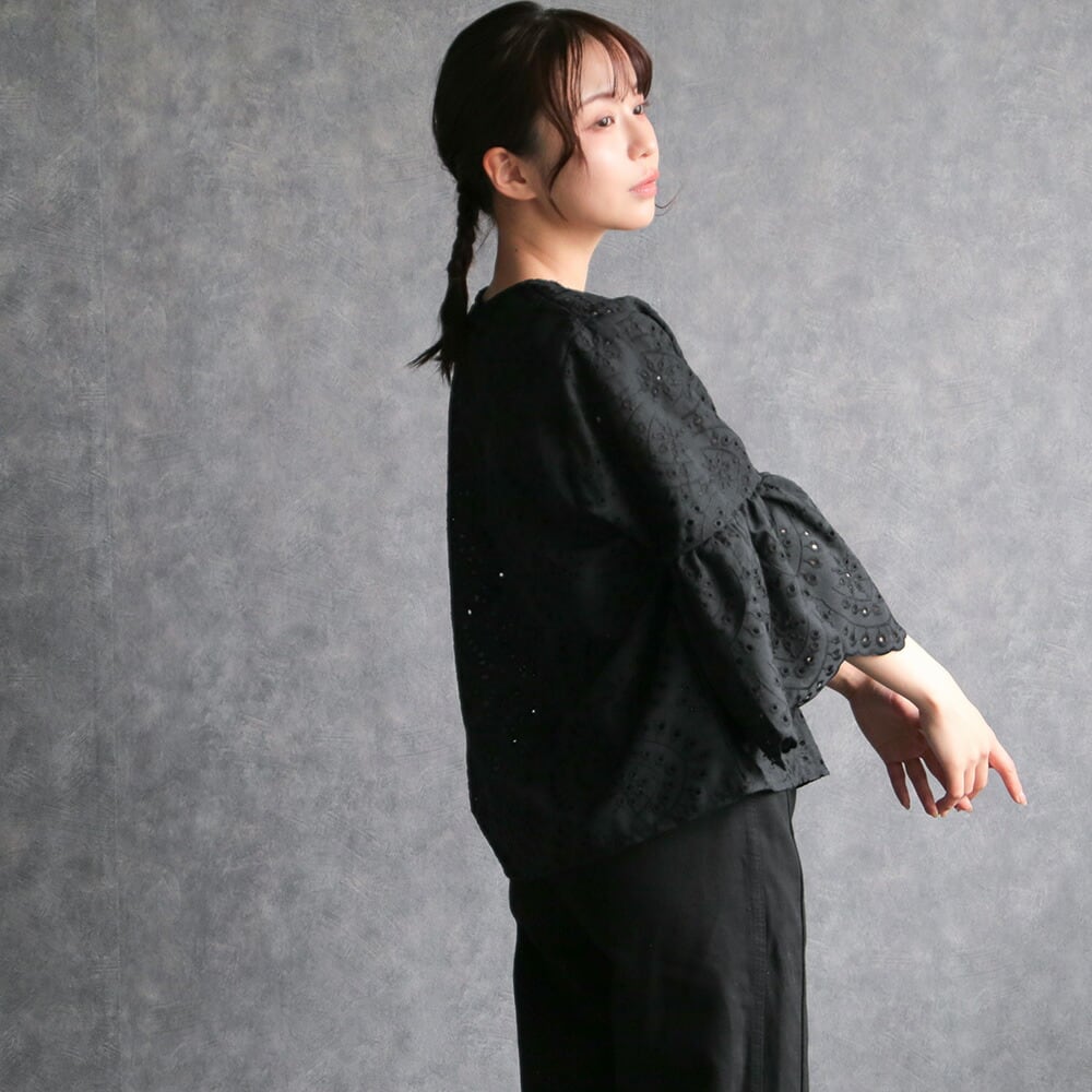 330128 any day エニーデイ 綿100% ブラウス シャツ コットン トップス 刺繍 レース スカラップ 黒 ブラック レディース 七分袖 体型カバー ゆったり 春 夏 20代 30代 40代 送料無料