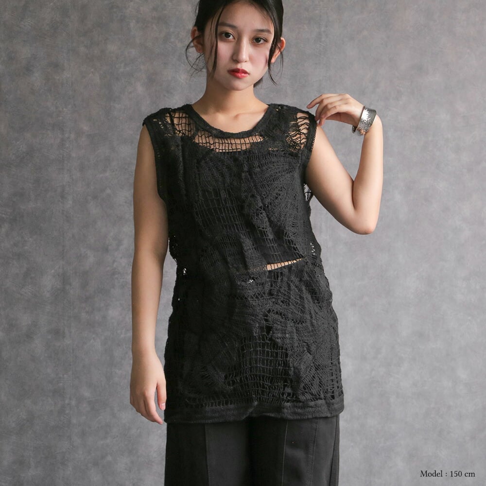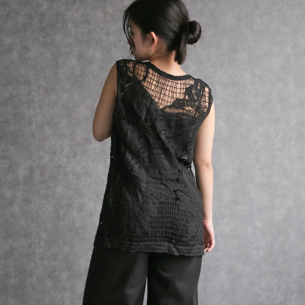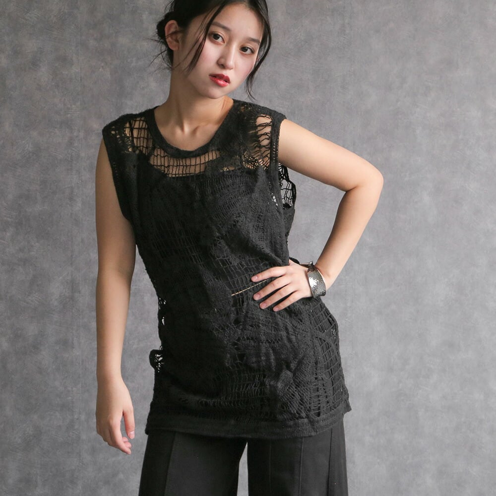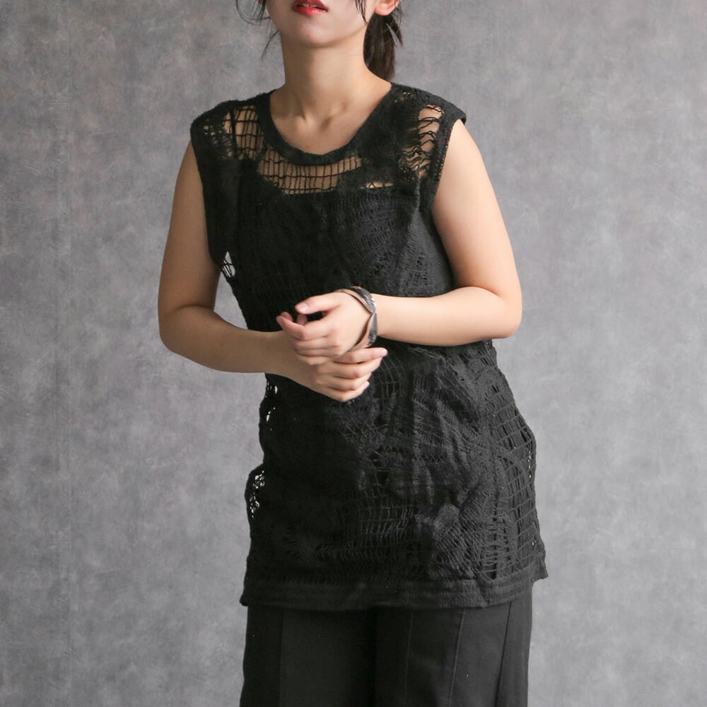 トップス ノースリーブ シャツ カットソー ブラック 編み 重ね着 シンプル モード 大人可愛い 透かし編み 海 旅行