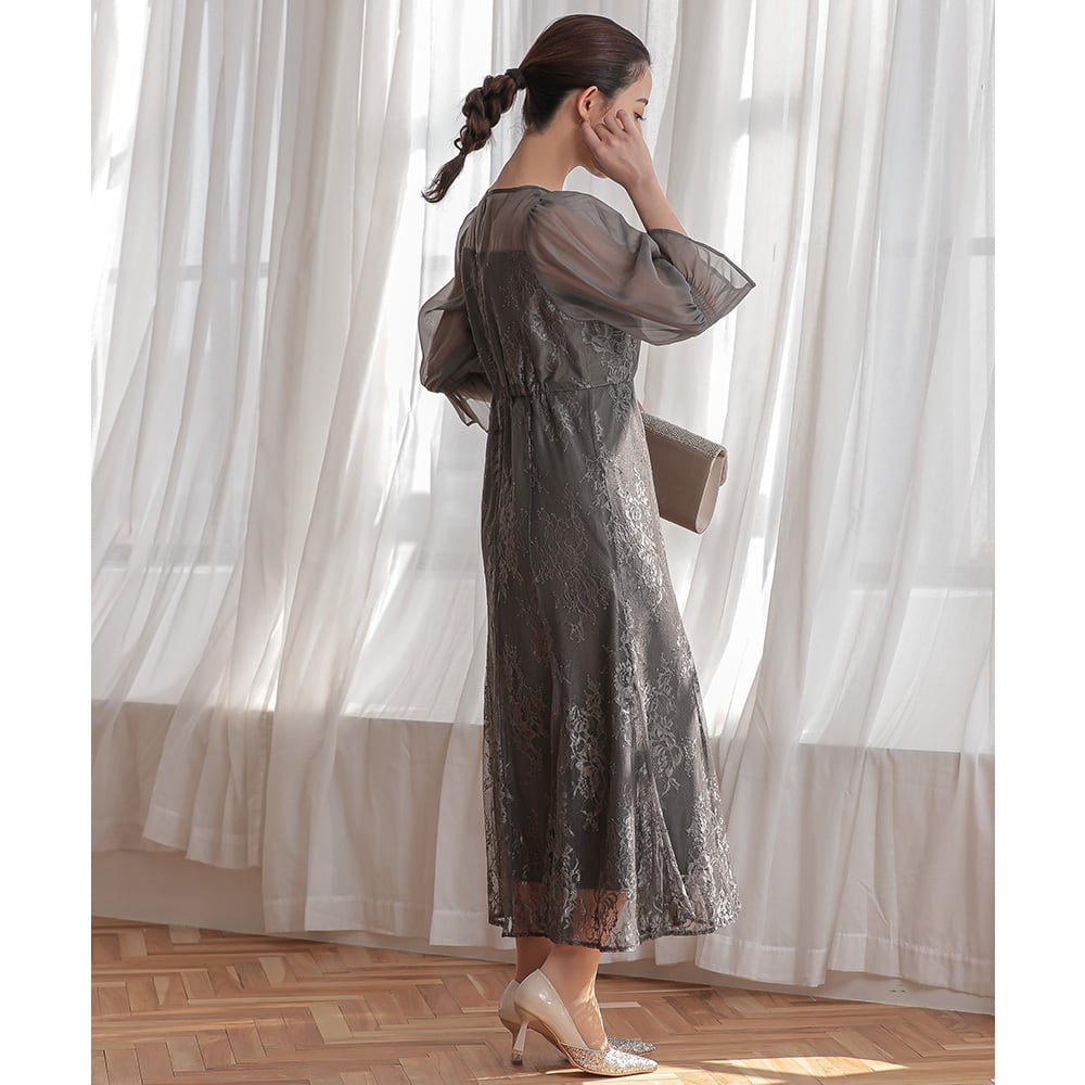 ふんわりとしたパフスリーブとマーメイドのシルエットのかけ合わせが大人の可愛らしさを演出する一着