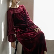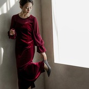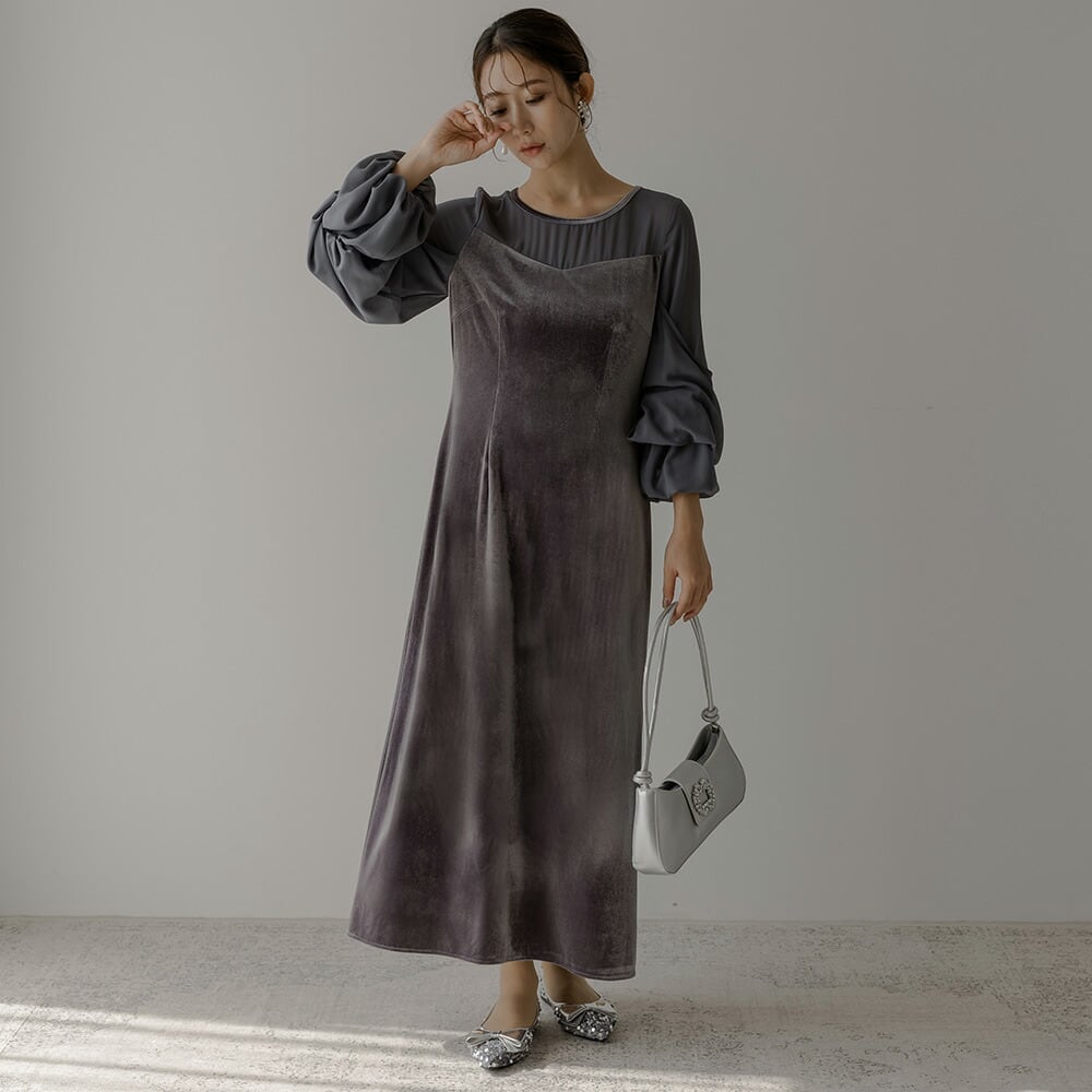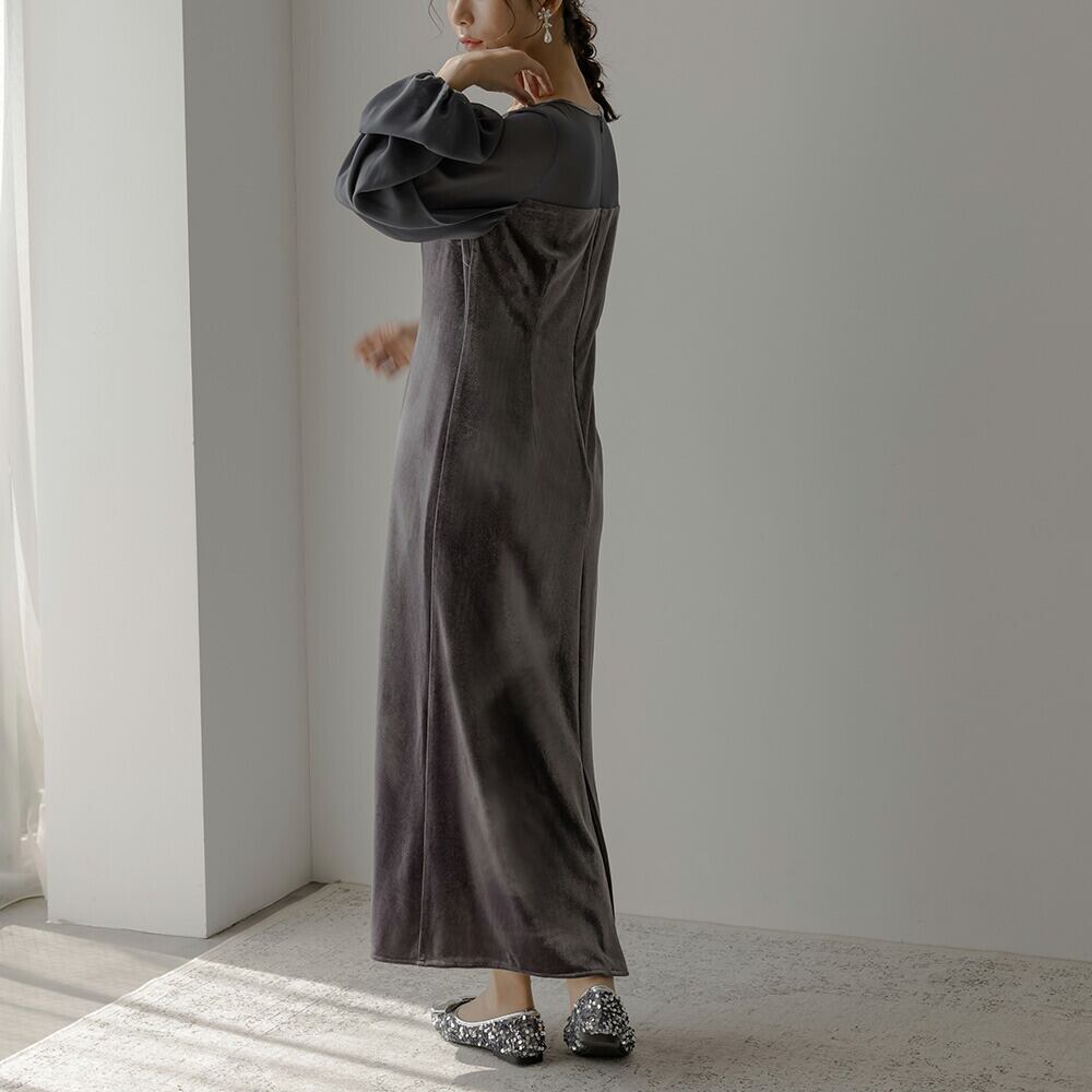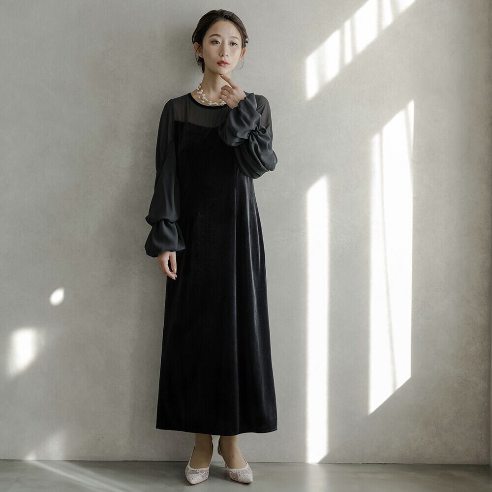 上品で洗練されたデザインが際立つ、ベロアとシフォンの異素材コンビネーションドレス。