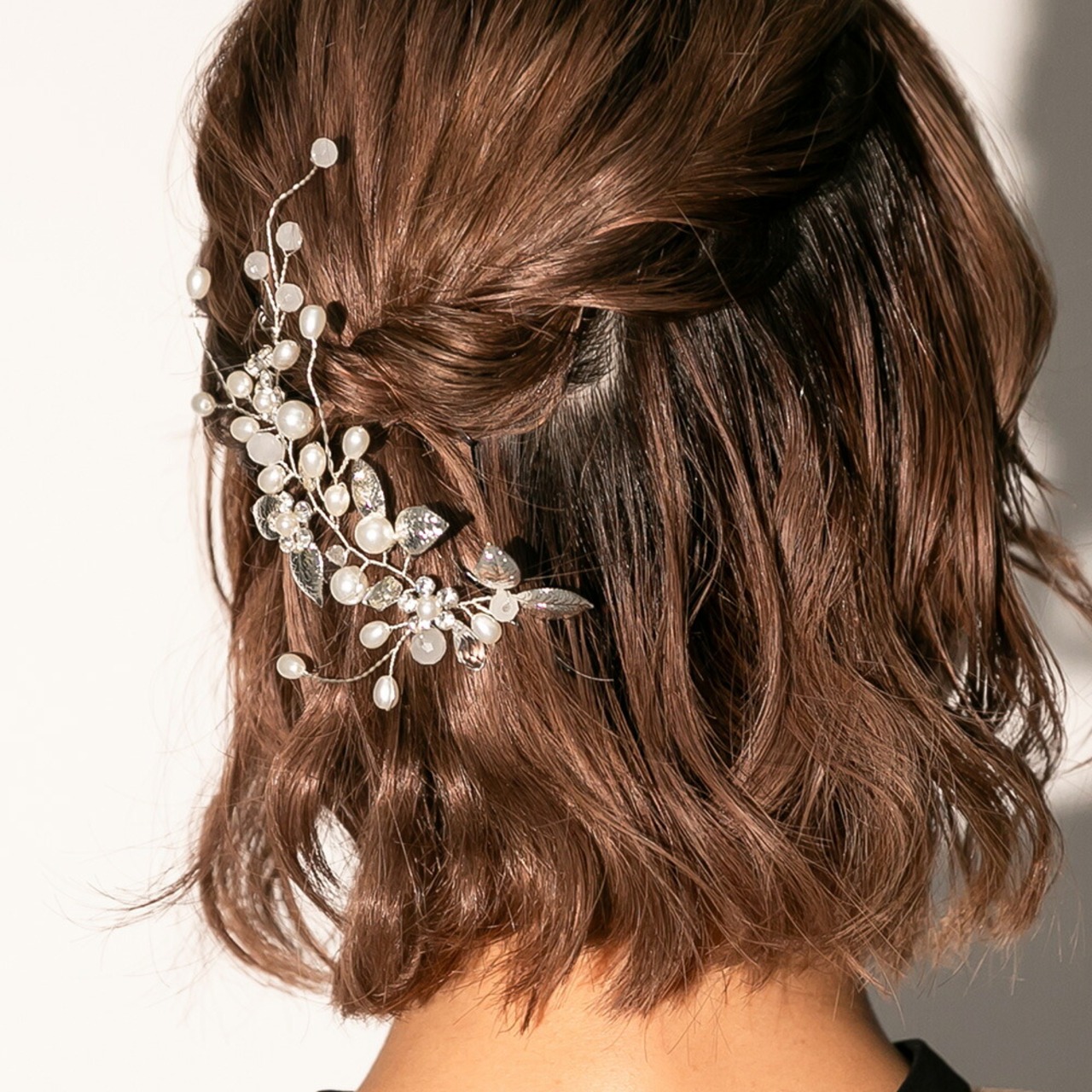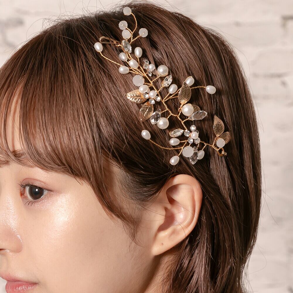リーフモチーフとパールの絶妙な組み合わせが、髪に自然な美しさと上品な輝きを添えます。